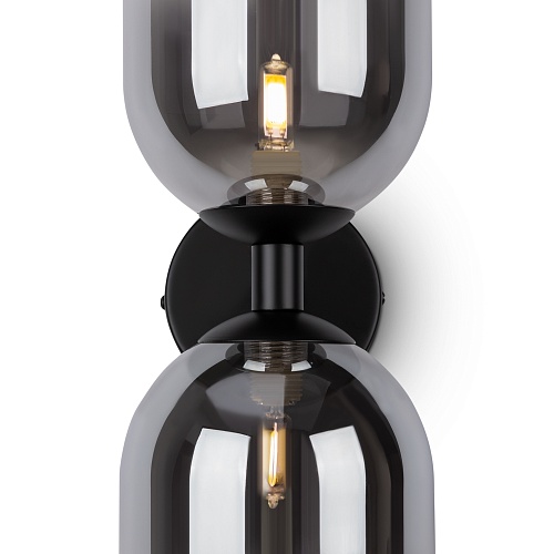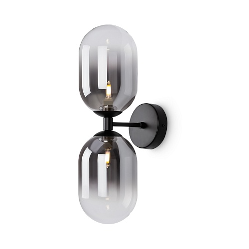 Арматура из металла матового черного цвета. Плафон из стекла с окрасом растяжка. Цвет дымчатый. Модификация — настенные, потолочные и настольные светильники. Источник света — лампа. Цоколь G9.