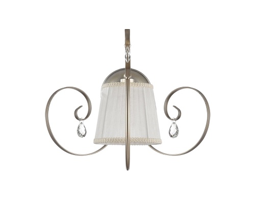 Абажуры и арматура светильников выполнены в разных цветах, с несколькими видами арматуры. Основание люстры украшено стеклянным декоративным элементом, а завитки рожков украшают подвески.