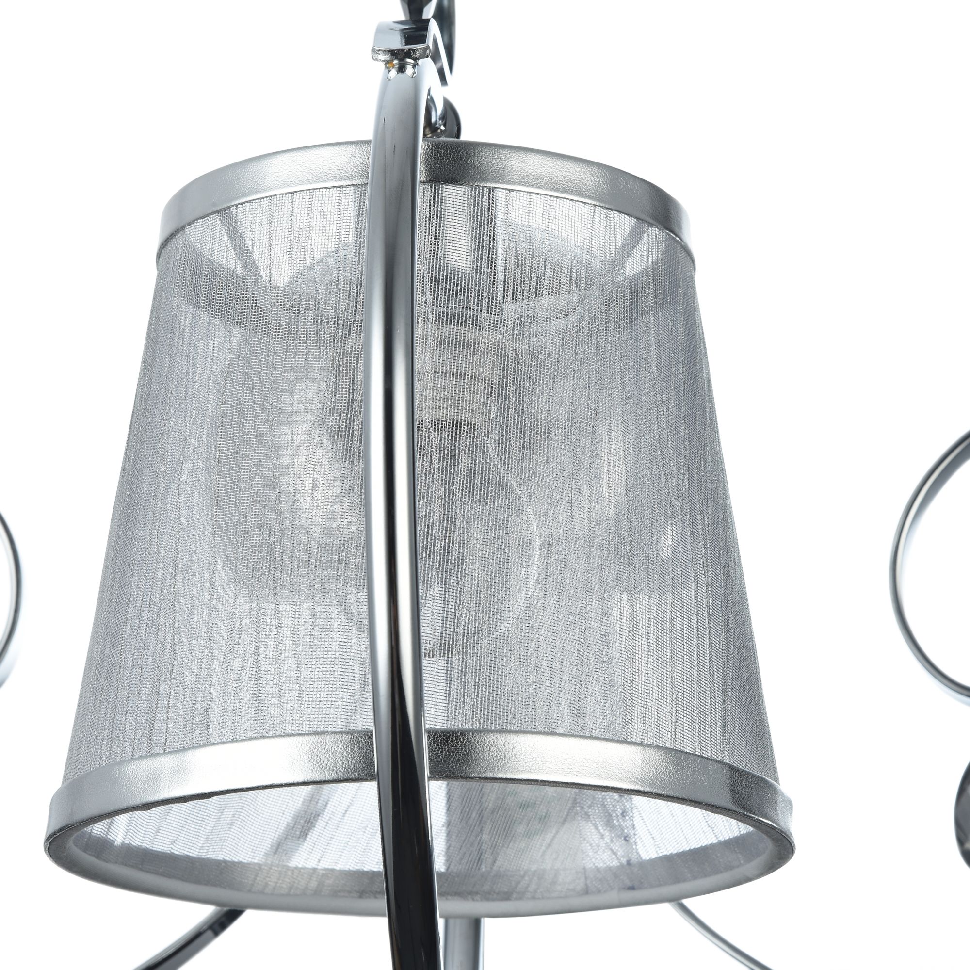 Абажуры и арматура светильников выполнены в разных цветах, с несколькими видами арматуры. Основание люстры украшено стеклянным декоративным элементом, а завитки рожков украшают подвески.