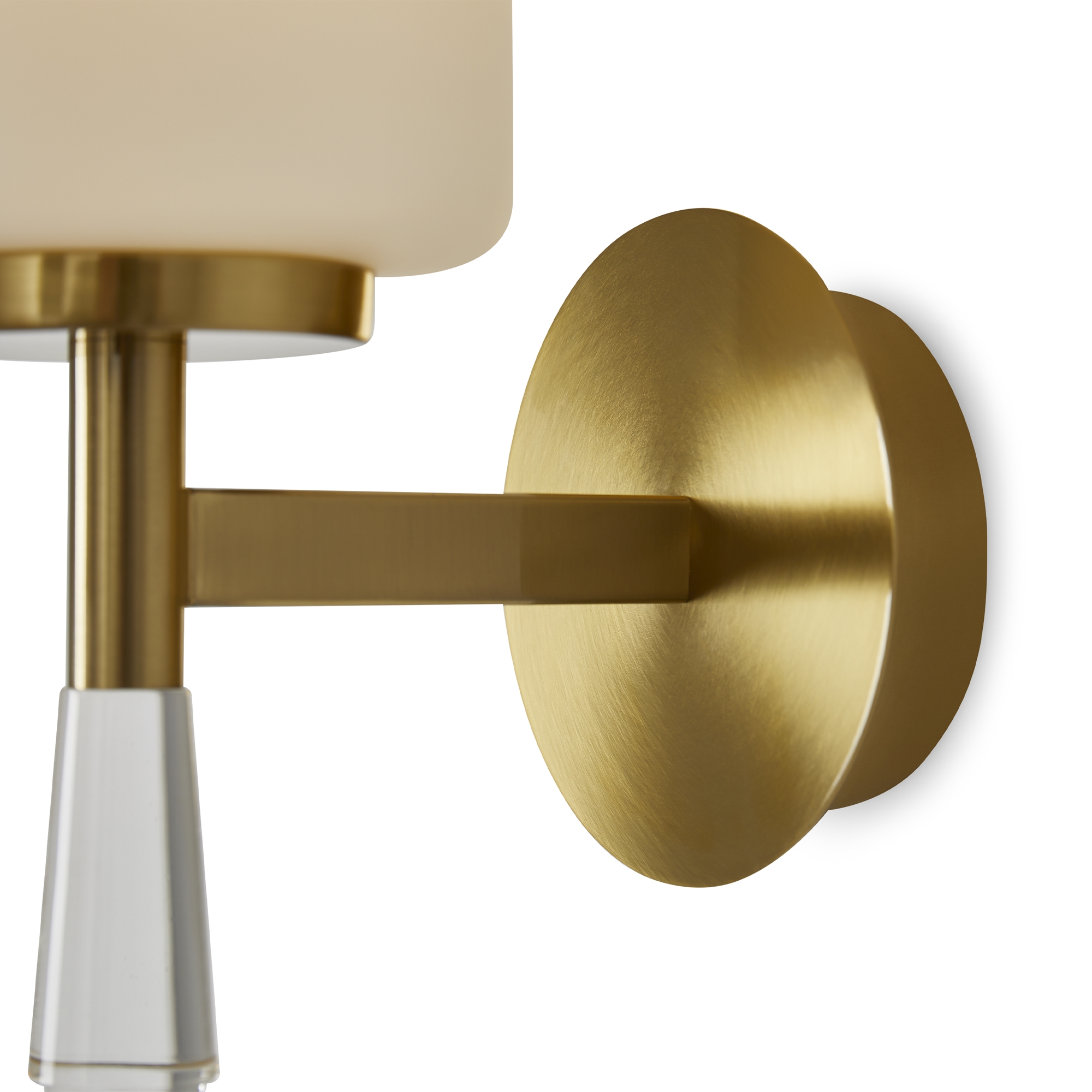 Арматура металл. Цвет латунь. Стеклянные белые плафоны хорошо рассеивают свет, направлены вверх, тем самым вытягивают потолок. Декоративные элементы в виде хрустального основания и капель из акрила. Источник света — лампа. Цоколь E27.