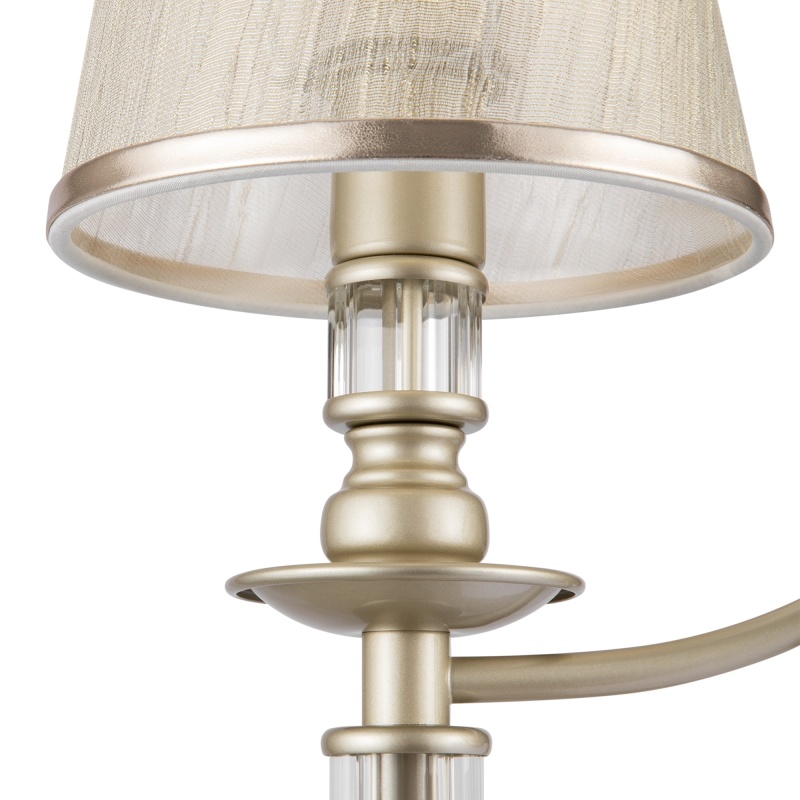 Арматура из металла в двух оттенках: матовое золото и латунь. Абажуры – текстиль на ПВХ бежевого оттенка. Часть абажуров в серии декорирована узорным кантом, часть – атласным кантом в тон арматуре. Торшер с цоколем Е27, лампа, бра и люстры – Е14.