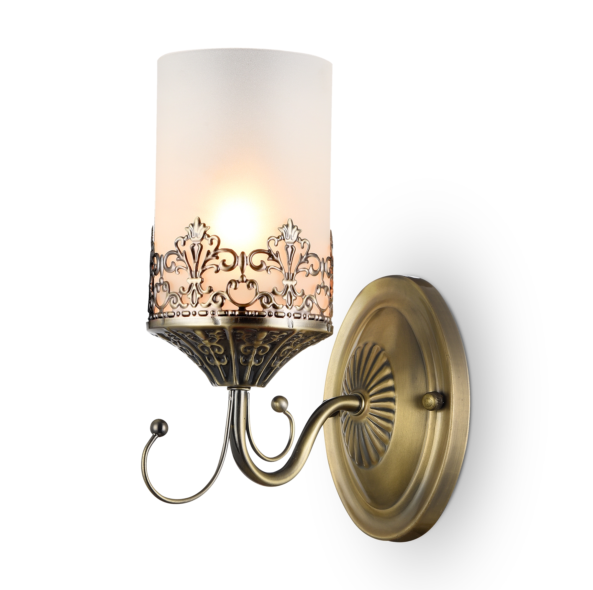 Нарядные и стильные светильники – прекрасное решение для интерьеров в современном стиле. Металлическая арматура окрашена в бронзовый цвет, плафоны из матового стекла в виде "свечек". Основание изделий и розетки украшены объемным орнаментом. Также светильники дополнены подвесками.