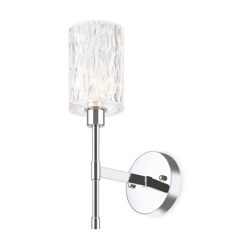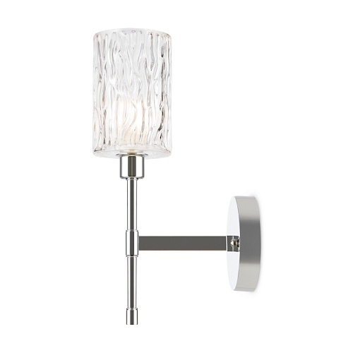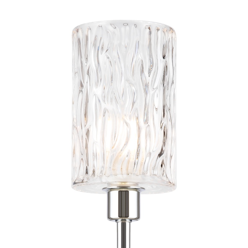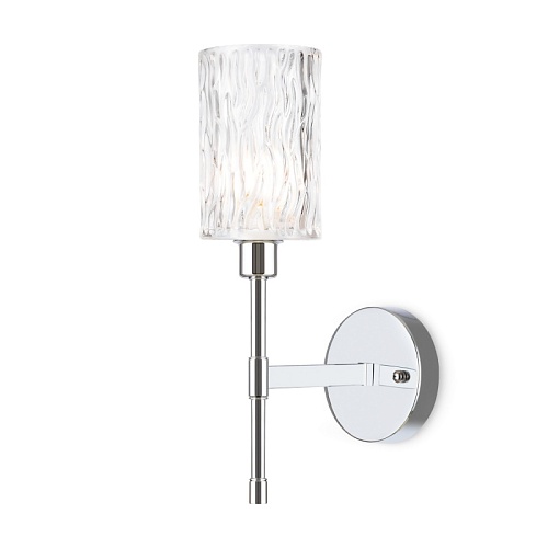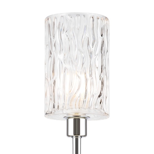 Хромированная металлическая арматура. Плафоны – фактурное прозрачное стекло. В качестве источника света используется лампа с цоколем Е14.