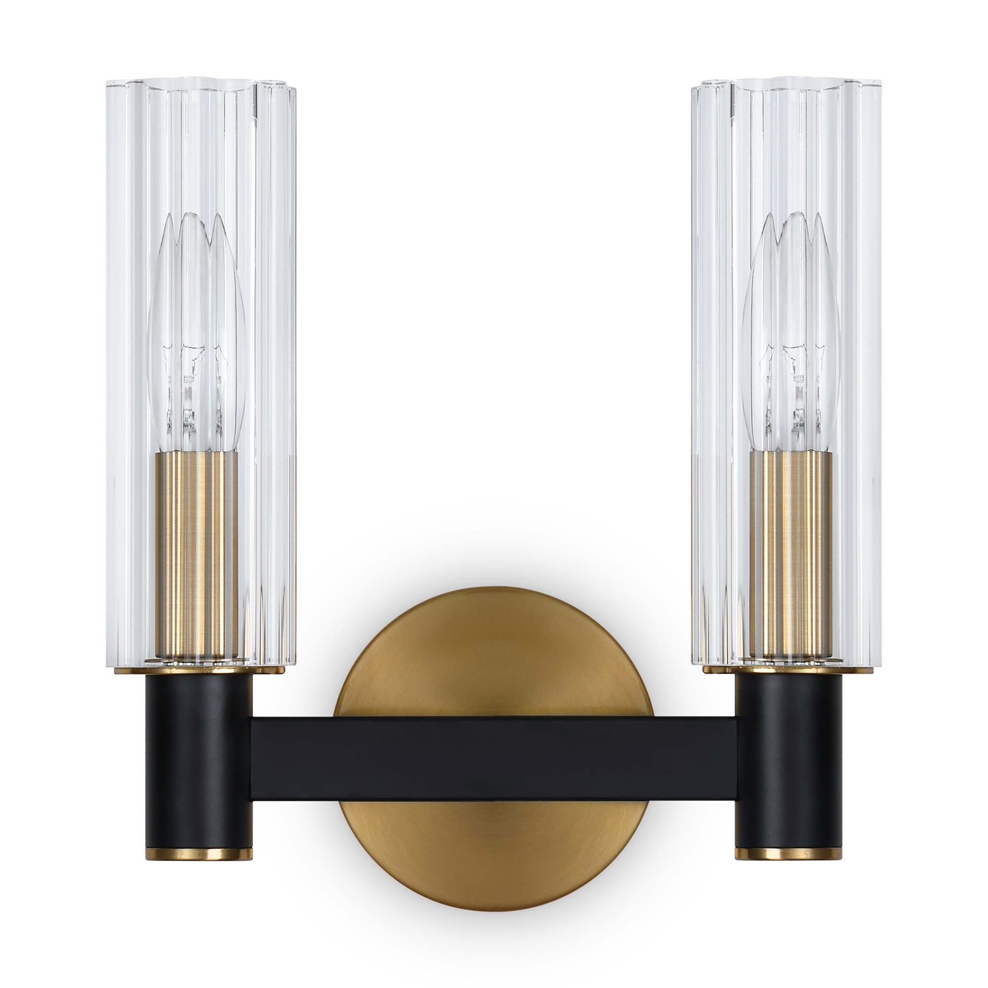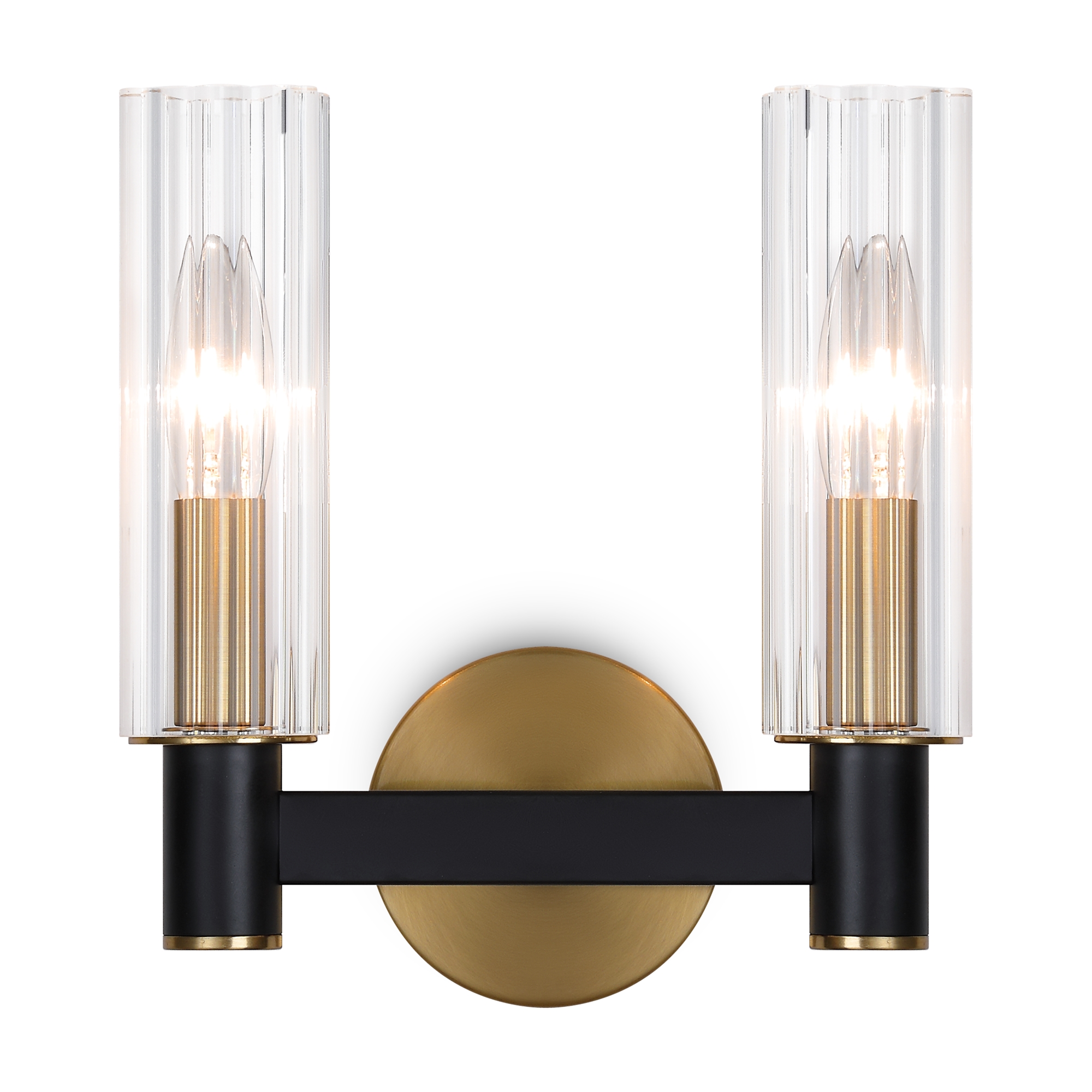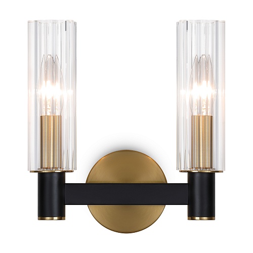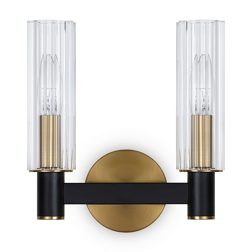 Арматура из металла сочетает два оттенка: черный и латунь. Плафоны цилиндрической формы выполнены из рельефного прозрачного стекла. Актуальная геометрия с настроением американской классики. Источник света – лампа с цоколем E14.