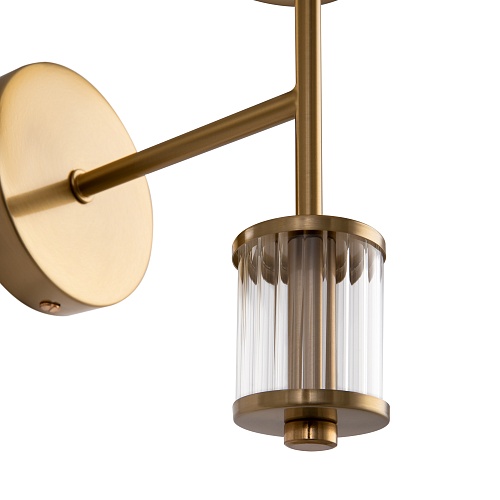 Металлическая арматура окрашена в цвет латуни. Плафоны-сферы из матового белого стекла. Декор – прозрачное рельефное стекло. Источник света – лампа с цоколем Е27.