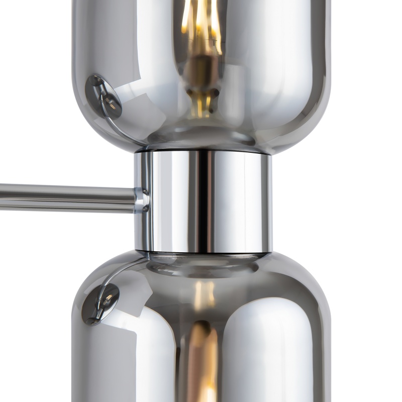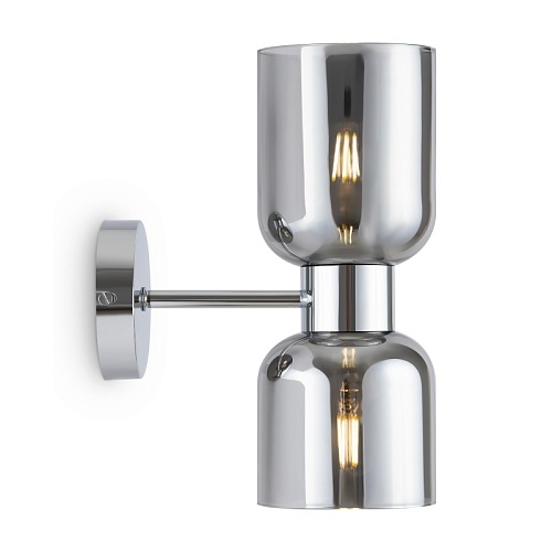 Арматура из металла. Оттенки – хром и латунь. Стеклянные плафоны в двух цветовых решениях: белый глянец и хром с зеркальным эффектом. Оригинальная форма плафонов «песочные часы», двунаправленный световой поток. Широкий ассортимент. Источник света – лампа с цоколем E27.