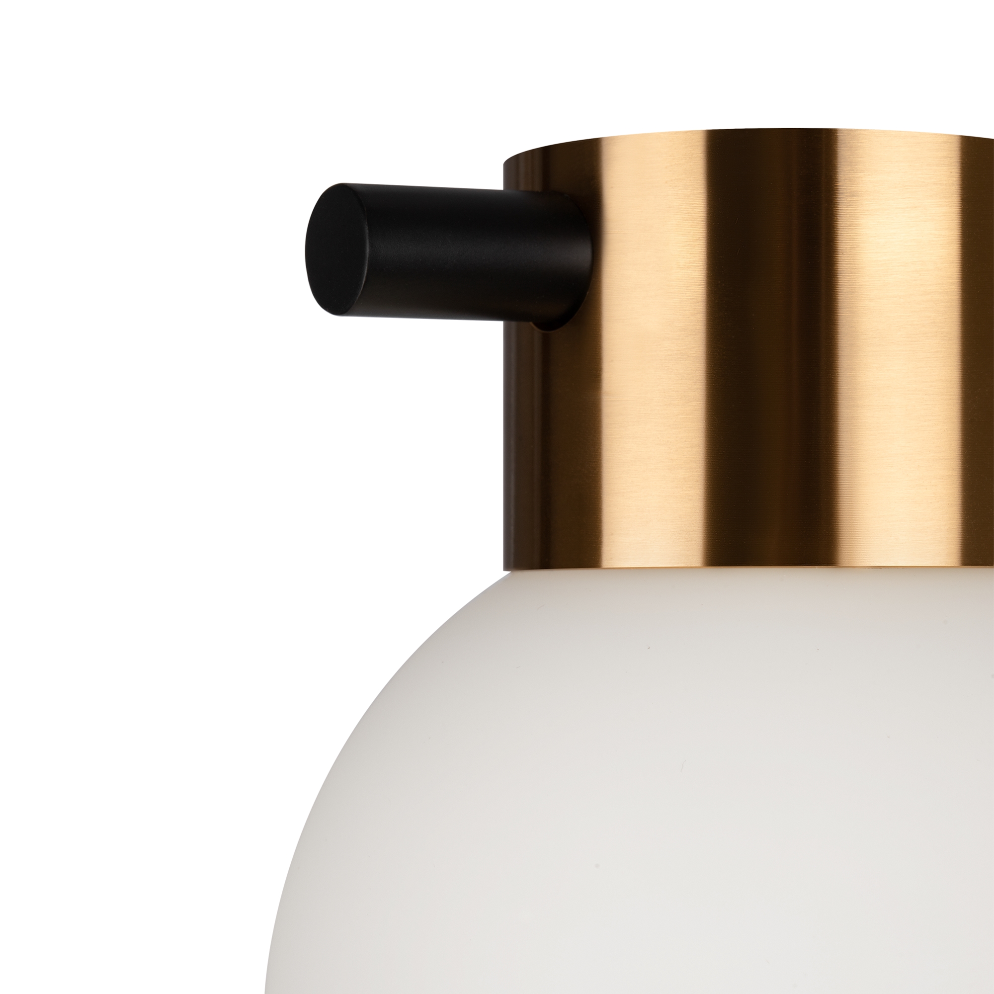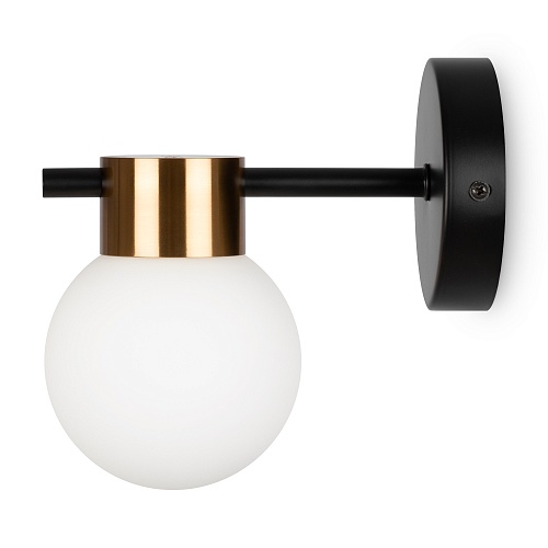 Металлическая арматура, цвет - черный + латунь. Стеклянные плафоны в двух оттенках - матовый белый или дымчатый. Направление плафонов в разные стороны позволяет распределить свет максимально равномерно. Источник светал - лампы с цоколем G9.