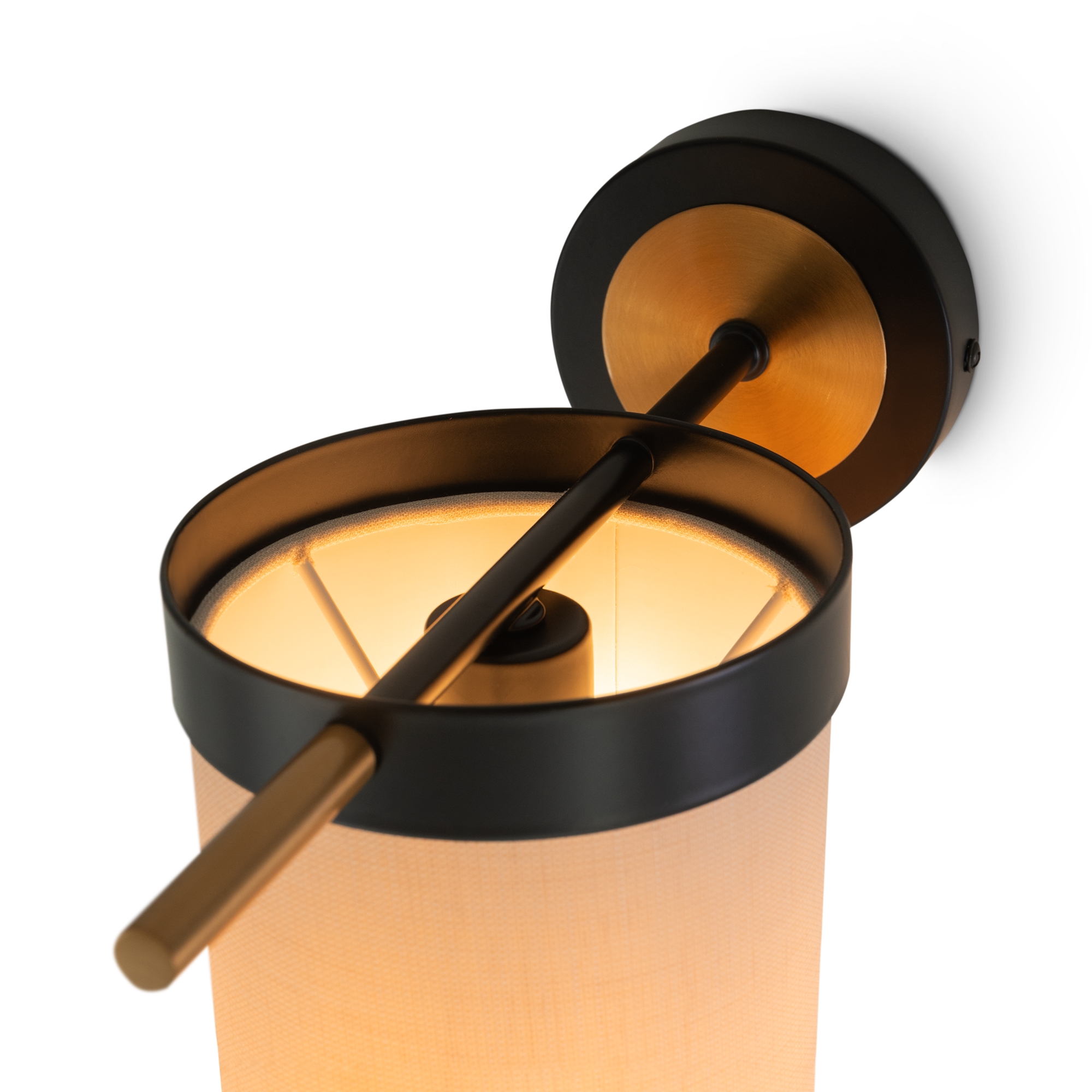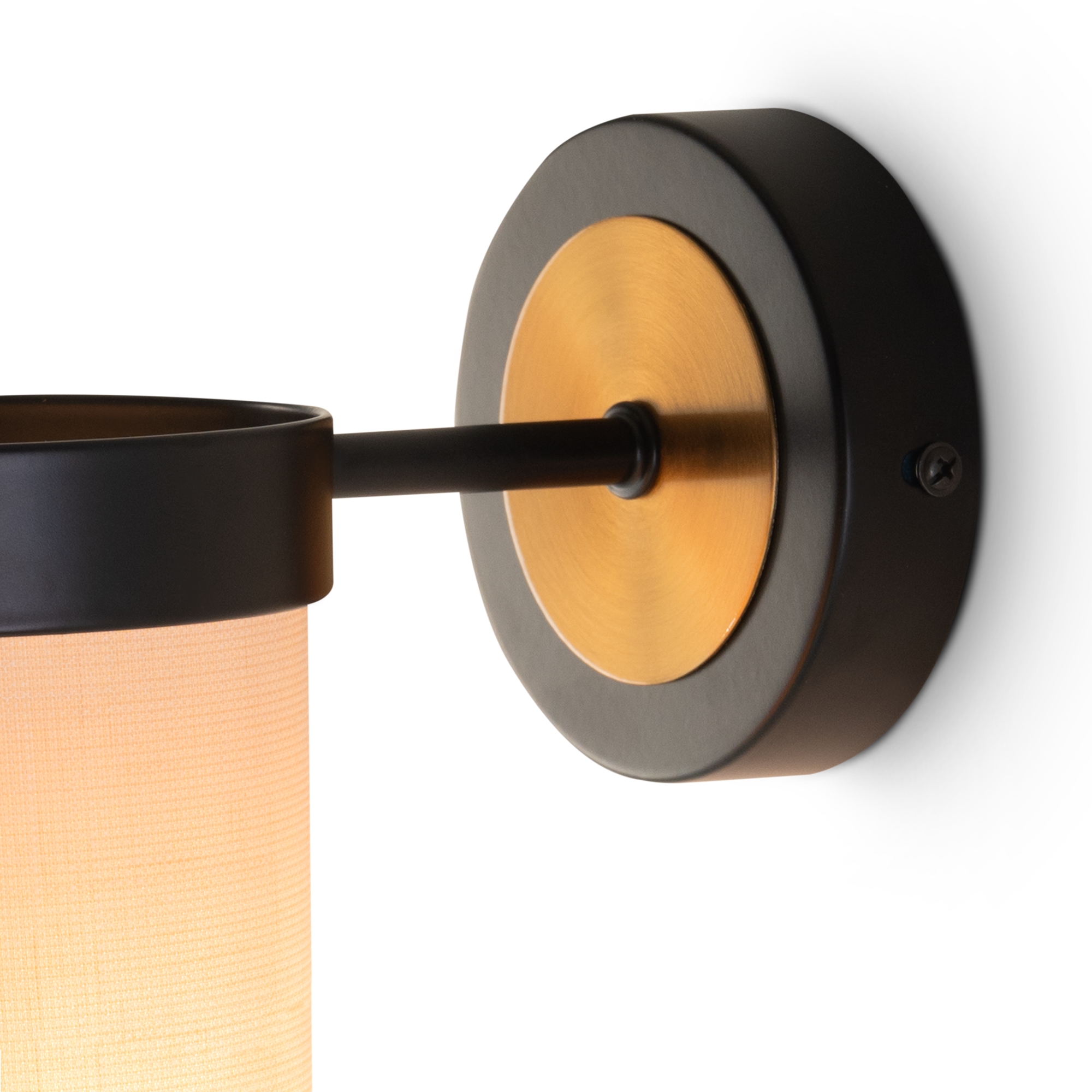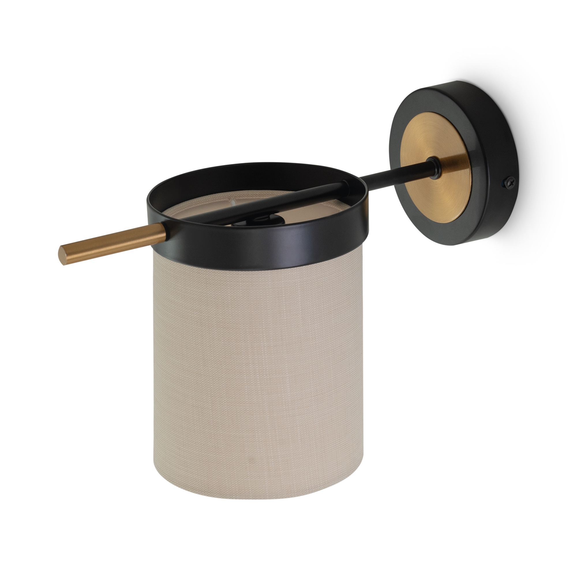 Арматура из металла. Основной цвет — чёрный, декоративные элементы в цвете латунь. Тканевые бежевые абажуры-цилиндры украшены чёрными металлическими основаниями. Компактные размеры для невысоких потолков. Источник света — лампа с цоколем Е14.