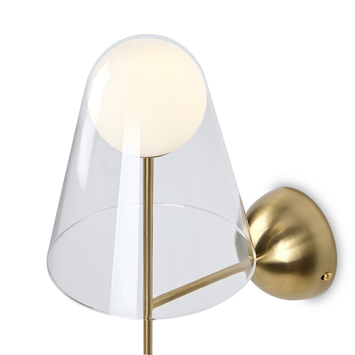 Арматура — металл, цвет — латунь. Двойные плафоны из стекла. Внешний — прозрачный в форме конуса плавно обрамляет контуры внутреннего матового сферического плафона. Свежий взгляд в дизайне на комбинацию форм и фактур. Источником света служит лампа с цоколем G9.