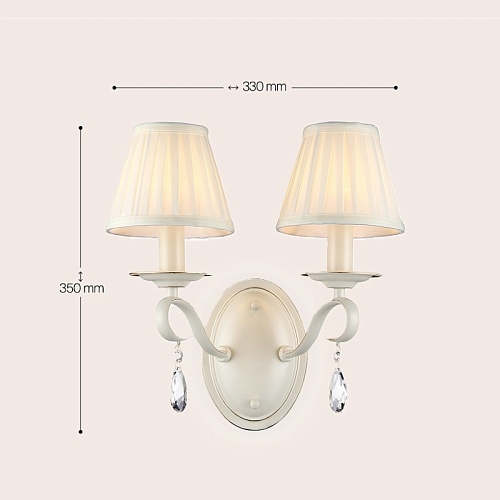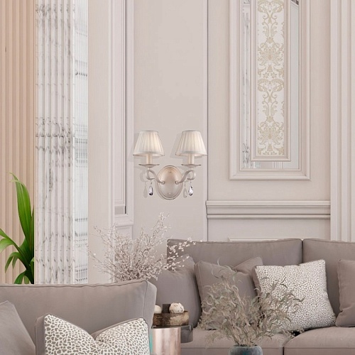 Материал арматуры — металл, цвет — бежевый. Белые абажуры из органзы изготовлены по технологии намотки. Декоративные подвески из прозрачных кристаллов. Регулируемая высота подвесных светильников. Источник света - лампа с цоколем Е14.