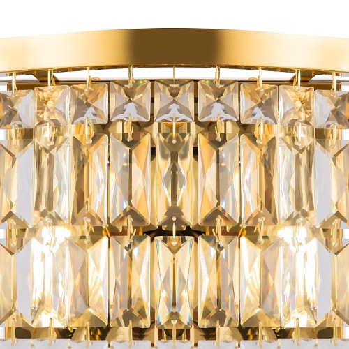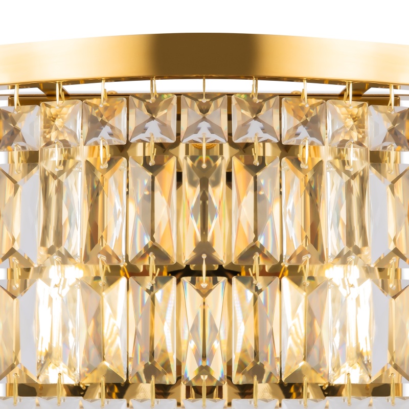 Металлическая арматура в двух оттенках: хром, золото. Декор – прозрачные кристаллы. Потолочные модели имеют два яруса подвесок. Высота подвесной люстры регулируется тросом.