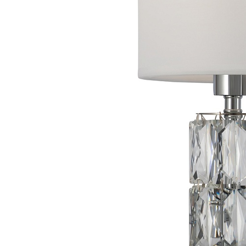 Арматура из металла, цвет – хром. Абажуры из текстиля, нанесенного на ПВХ. Цвет – белый. Декор – массивные кристаллы сложной огранки. Высота подвесных моделей регулируется.