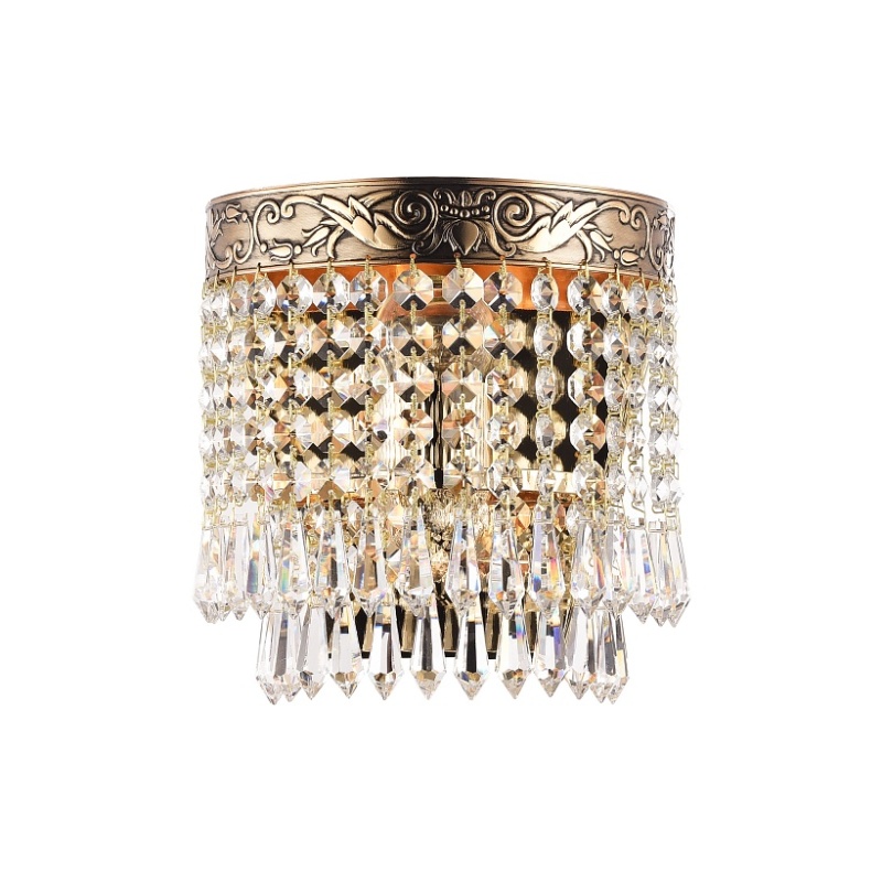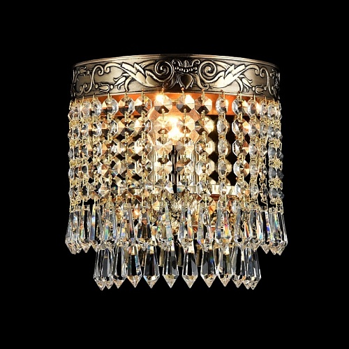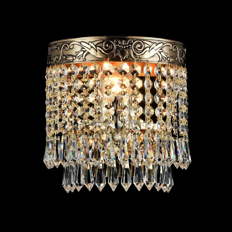 Арматура из металла, цвет – античное золото. Декор металлических элементов – инкрустированный цветочный орнамент. Многоярусные хрустальные подвески скрывают лампы. Часть моделей имеет открытые источники света в виде свечей.