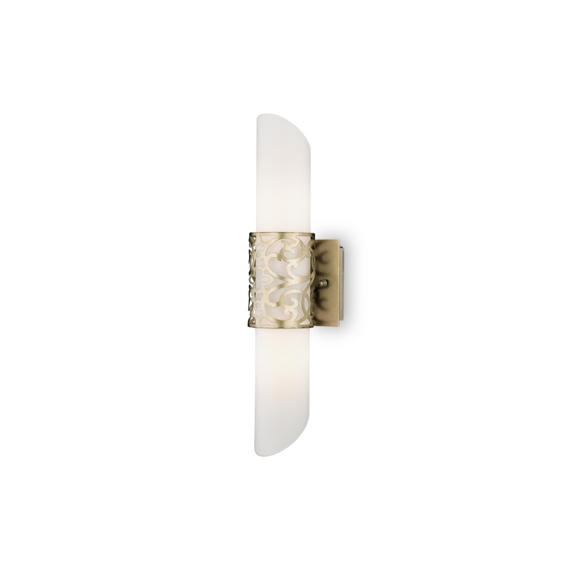 Арматура из металла, цвет – латунь. Абажур – хлопок на ПВХ, плафон бра – белое стекло. Декор – металлический обруч с просечным орнаментом. Потолочная модель с рассеивателем. Высота подвесного светильника регулируется. Источник света - дампа с цоколем Е14.