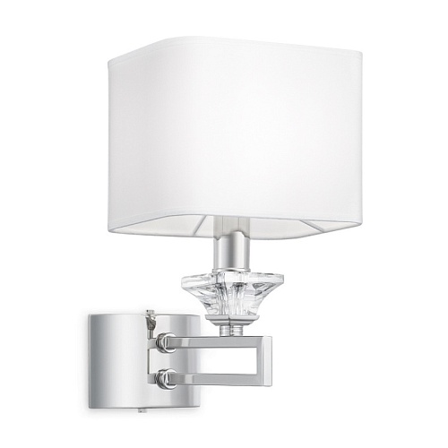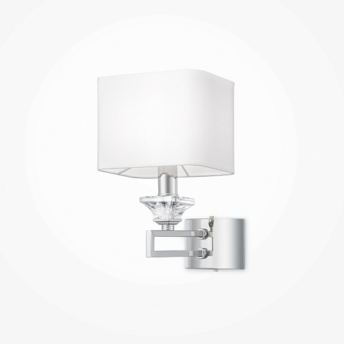Хромированная металлическая арматура. Абажуры из белого текстиля, нанесенного на ПВХ. Стеклянный декор центральной части и розеток. Геометрические рожки.