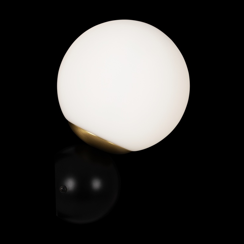 Арматура из металла в цвете матового золота. Плафоны-сферы из матового выдувного стекла. Модная асимметрия в дизайне. Источник света — лампы с цоколем Е14.