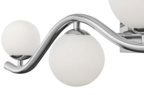 Металлическая арматура представлена в двух оттенках: хром и золото. Белые плафоны-сферы из матового стекла. Каркас оригинальной волнистой формы. Высота подвесных моделей регулируется тросом.