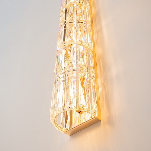 Материал арматуры – металл, оттенки – хром и золото. Декор – прозрачные стек лянные кристаллы. Архитектурная огранка декоративных элементов. Цоколь Е14.