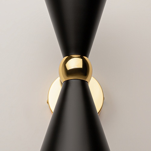 Материал арматуры - металл, оттенок – золото. Металлические плафоны изнутри окрашены в золотой цвет, снаружи в двух вариантах: черный и белый. Поворотный механизм, рожки вращаются. Источник света - лампа с цоколем Е14.