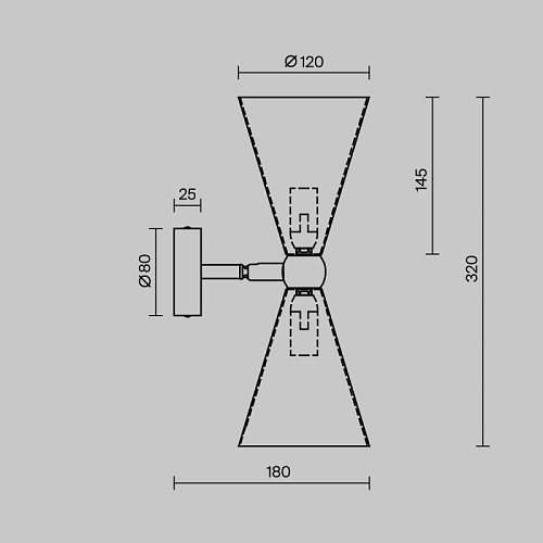 Материал арматуры - металл, оттенок – золото. Металлические плафоны изнутри окрашены в золотой цвет, снаружи в двух вариантах: черный и белый. Поворотный механизм, рожки вращаются. Источник света - лампа с цоколем Е14.