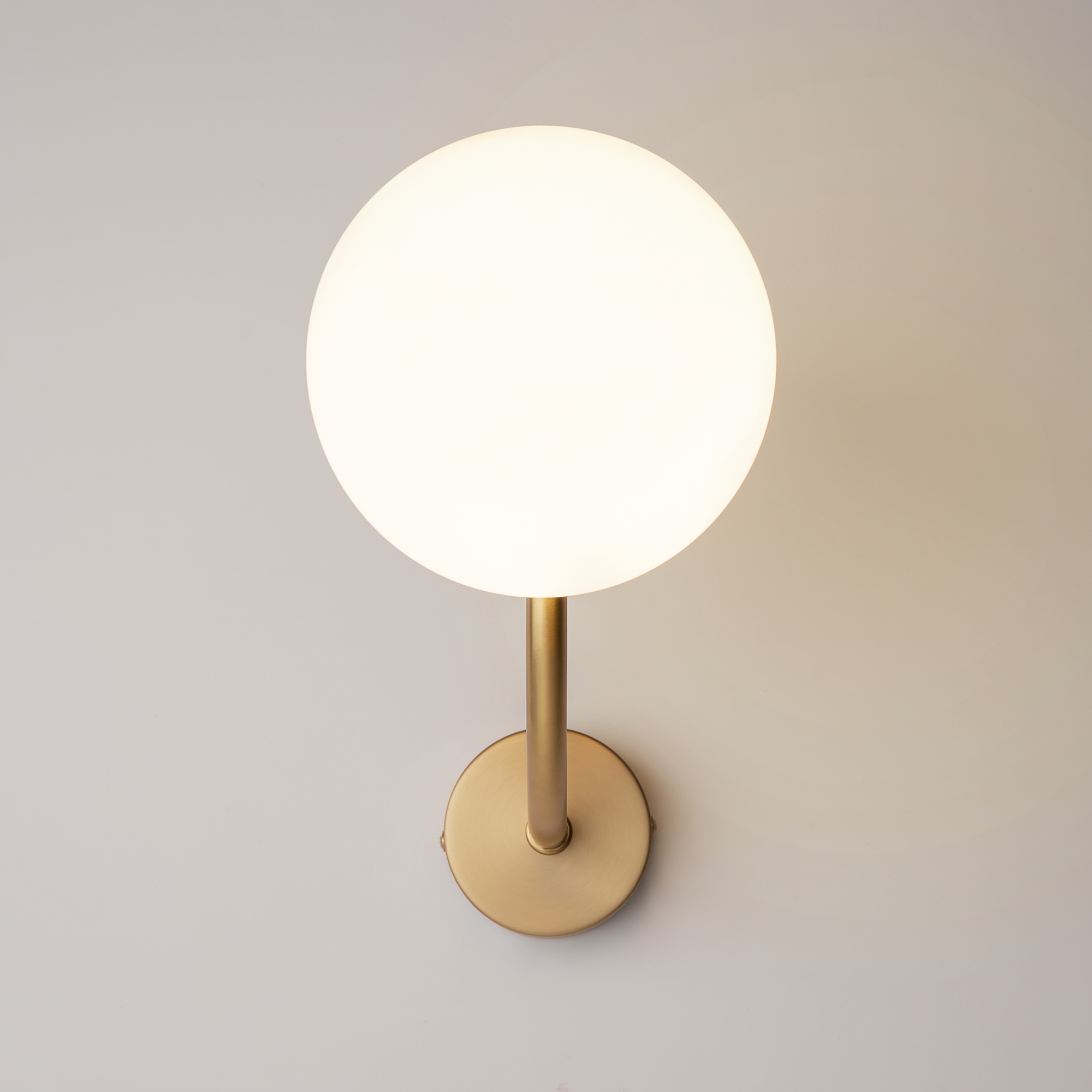 Арматура из металла окрашена в цвет латуни. Плафоны-сферы из матового белого стекла. Трендовые обтекаемые формы. Дизайн в стиле ретро. Источник света — лампы с цоколем Е14.