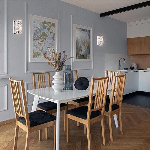 Арматура из нержавеющей стали и стекла, цвет арматуры – хром. Фактурный плафон с декором из стеклянного массива. Источник света – светодиоды с цветовой температурой 3000К.