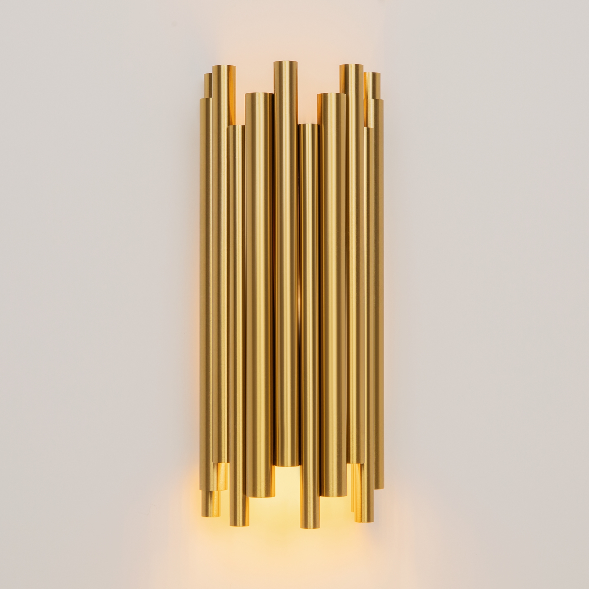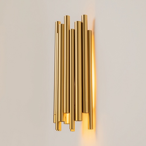 Материал арматуры – металл, цвет – латунь. Декор в виде трубок из нержавеющей стали в бронзовом цвете. Последний ряд декора – стеклянные трубки – обеспечивает невесомый силуэт.