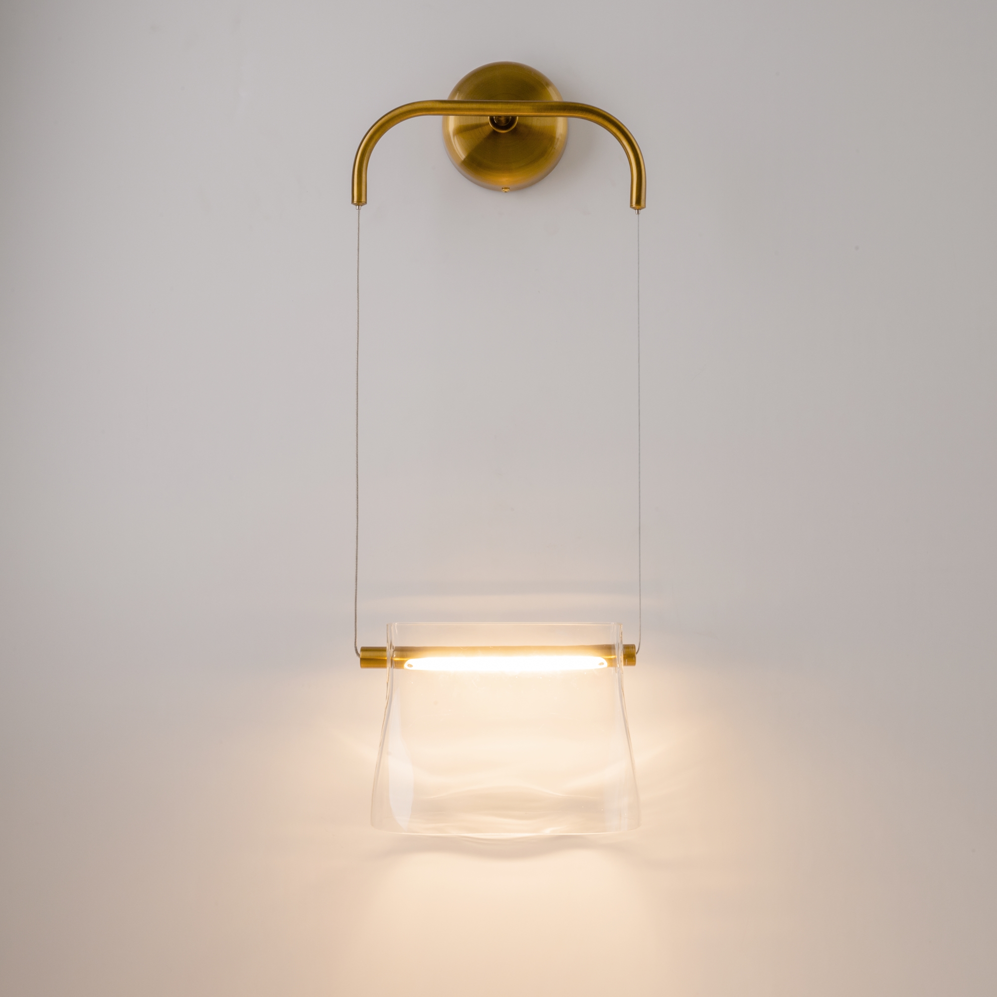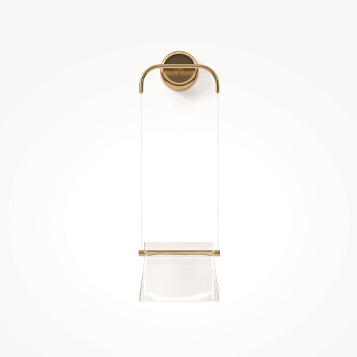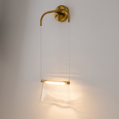 Цвет металлической арматуры — латунь с сатинированным финишем, плафоны — прозрачное стекло. Источник света: LED. Цветовая температура светильников 3000К, угол рассеивания — 120 градусов. Настенные бра и подвесные светильники оснащены регулируемым проводом длиной до 3 метров, что позволяет использовать их в помещениях с высокими потолками.