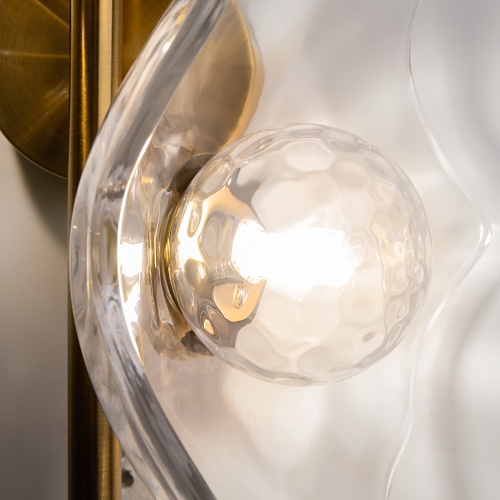 Арматура - металл, цвет - латунь. Плафоны-соцветия из литого стекла в плавных формах. Эффектные световые блики на плавных рельефах плафона. Источник света - лампа с цоколем G9.