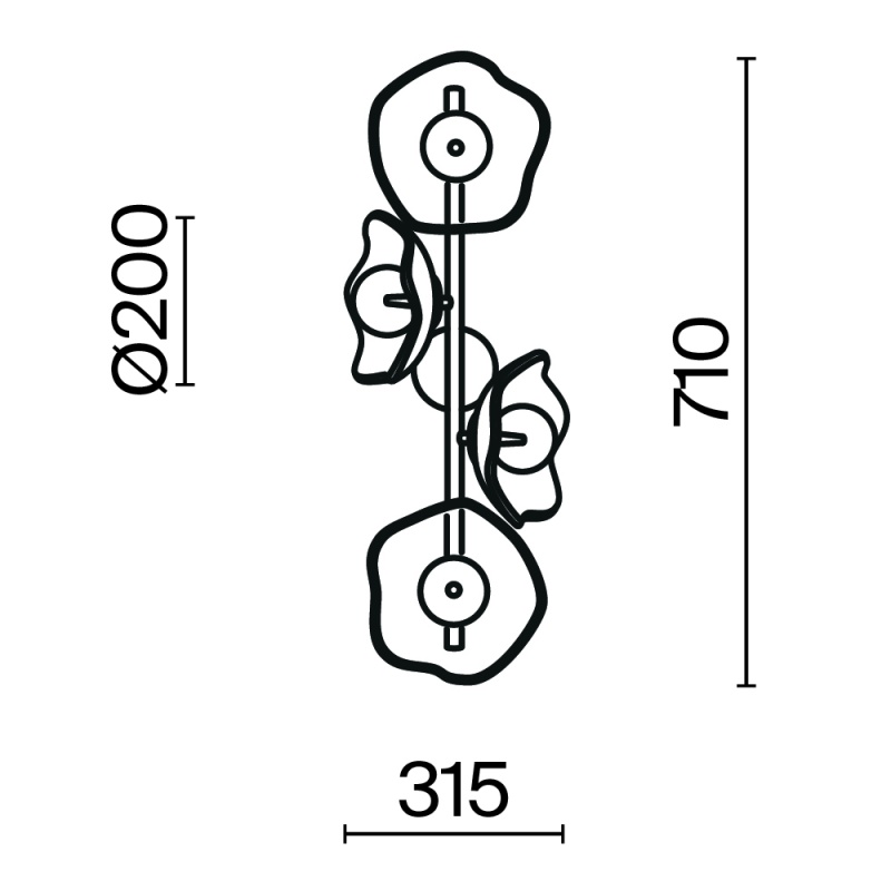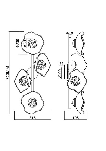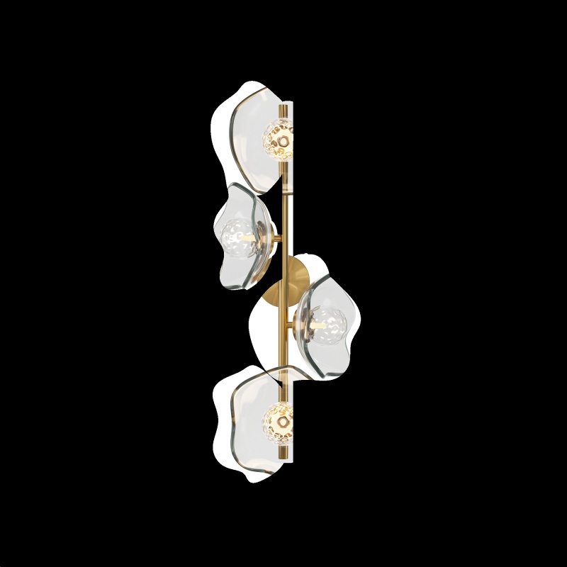 Арматура - металл, цвет - латунь. Плафоны-соцветия из литого стекла в плавных формах. Эффектные световые блики на плавных рельефах плафона. Источник света - лампа с цоколем G9.