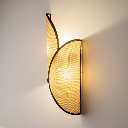 Черная металлическая арматура, коричневые плафоны из натуральной рогожки с черной тканевой окантовкой. Источник света: цоколь G9. Сменные лампы не входят в комплект. Регулируемая высота светильников с помощью разборных штанг. Плафоны пропускают значительный световой поток, он также попадает в пространство через отверстия снизу. Ассиметричная форма для разных стилей интерьеров. Левостороннее и правостороннее бра компонуется в интересные композиции.