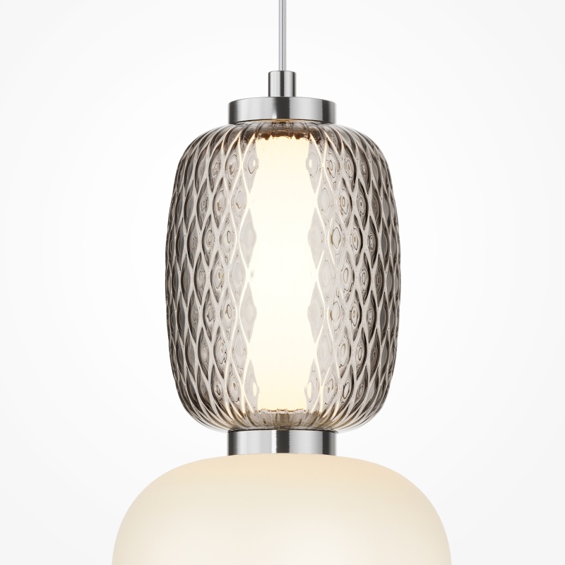 Металлическая арматура, цвет - золото, хром. Микс плафонов округлых и вытянутых форм из белого матового и прозрачного стекла с сетчатым и с линейным повторяющимся рельефным рисунком. Регулируемая высота подвесных моделей, провод - 3 метра. LED-источник света, цветовая температура 3000К.