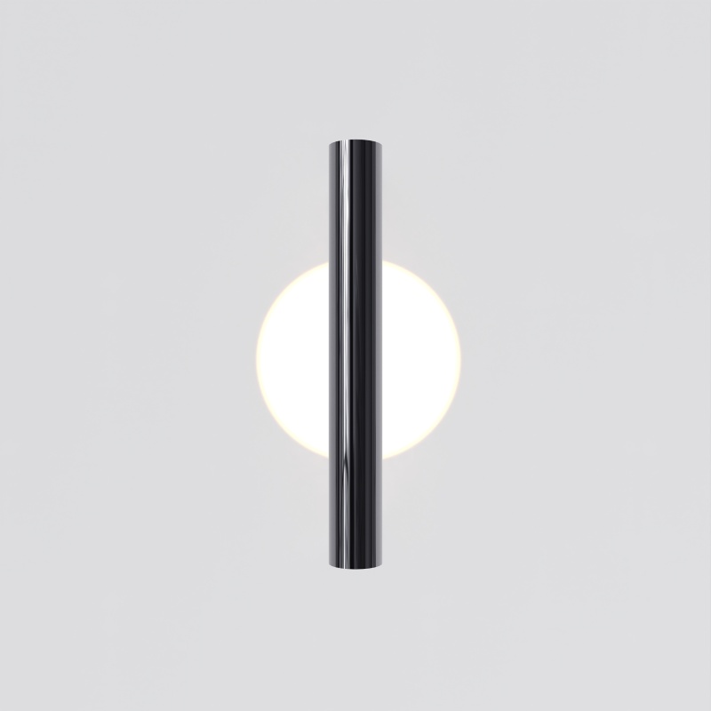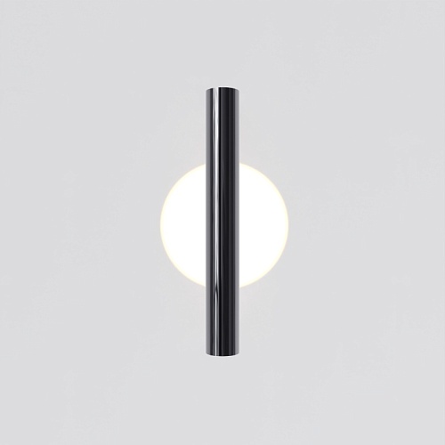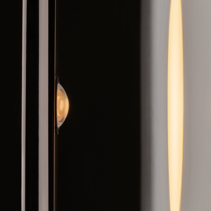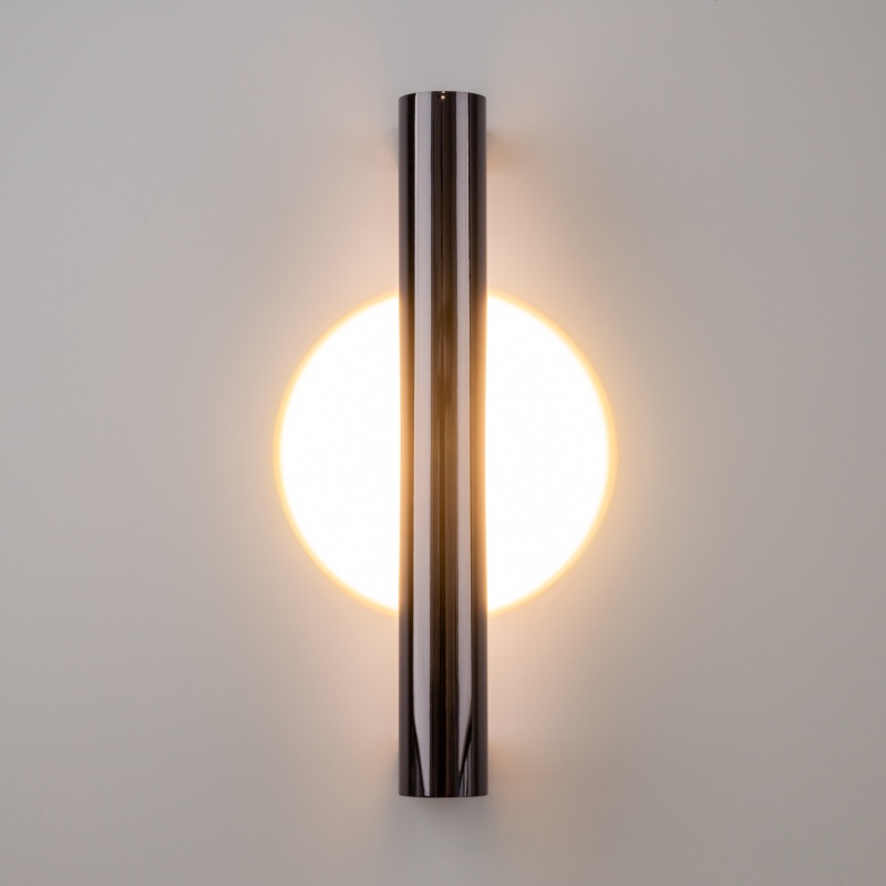 Металлическая арматура, цвета: черный, хром, золото. Источник света: LED-светодиод. Световая температура 3000К. Свет переотраженный, угол рассеивания 100 градусов. Дизайнерское решение с использованием линзы, создающей акцентный круг на стене и эффекта переотражения. Поверхность арматуры глянцевая, полузеркальная. Бра подойдет для зонирования помещений.