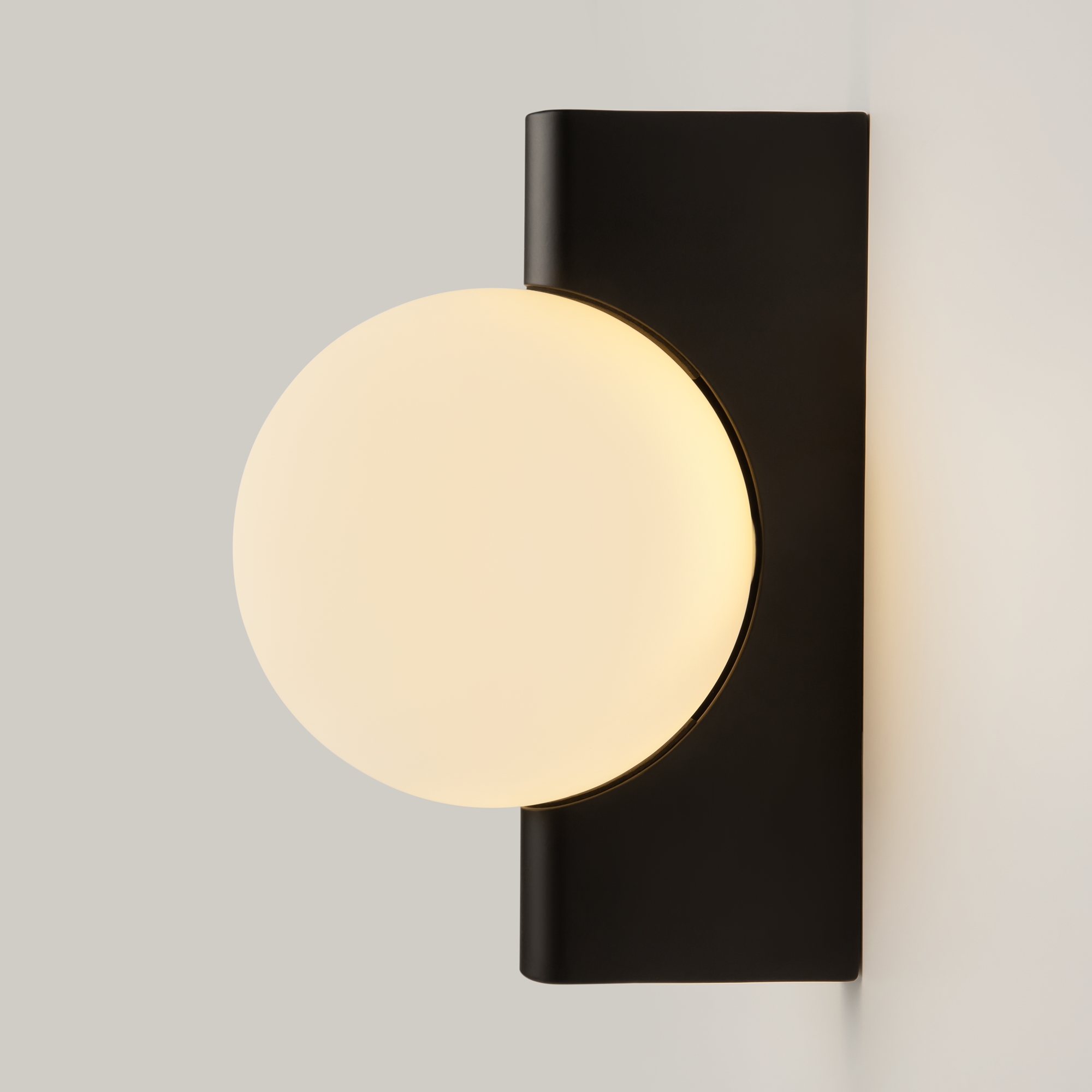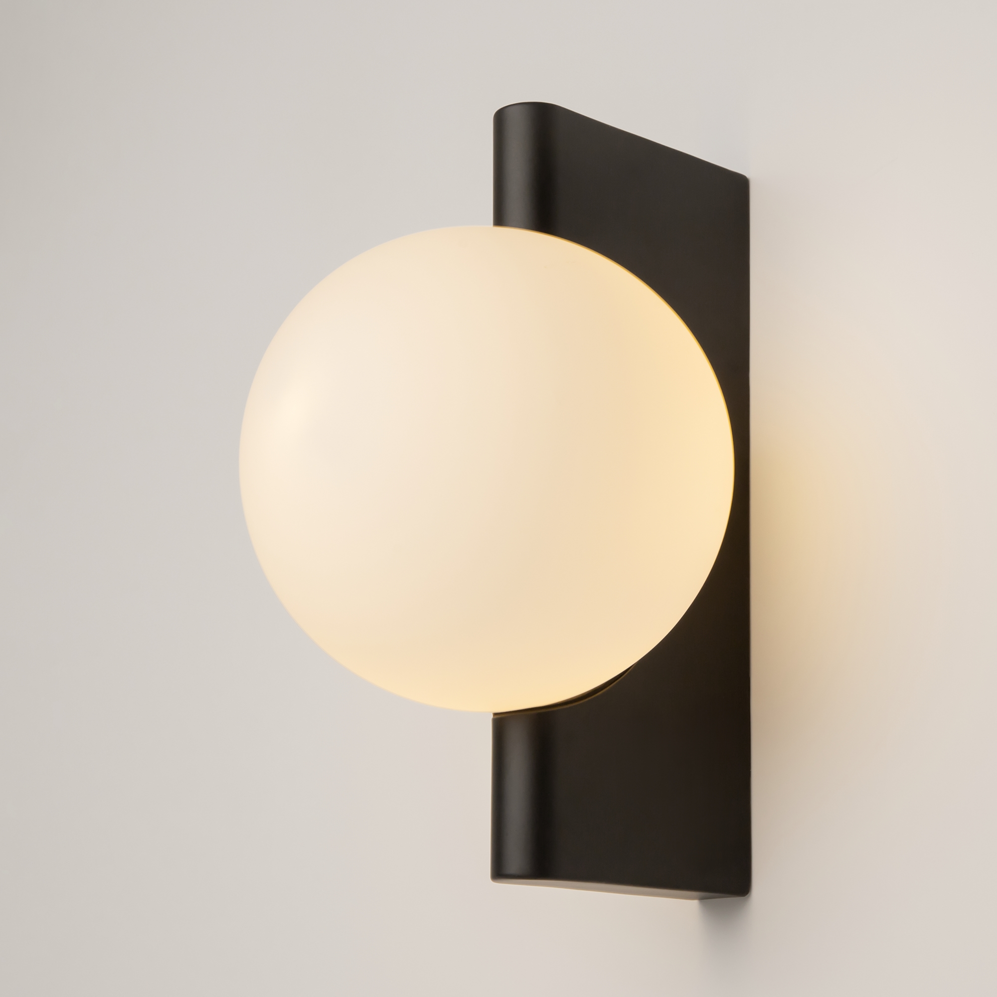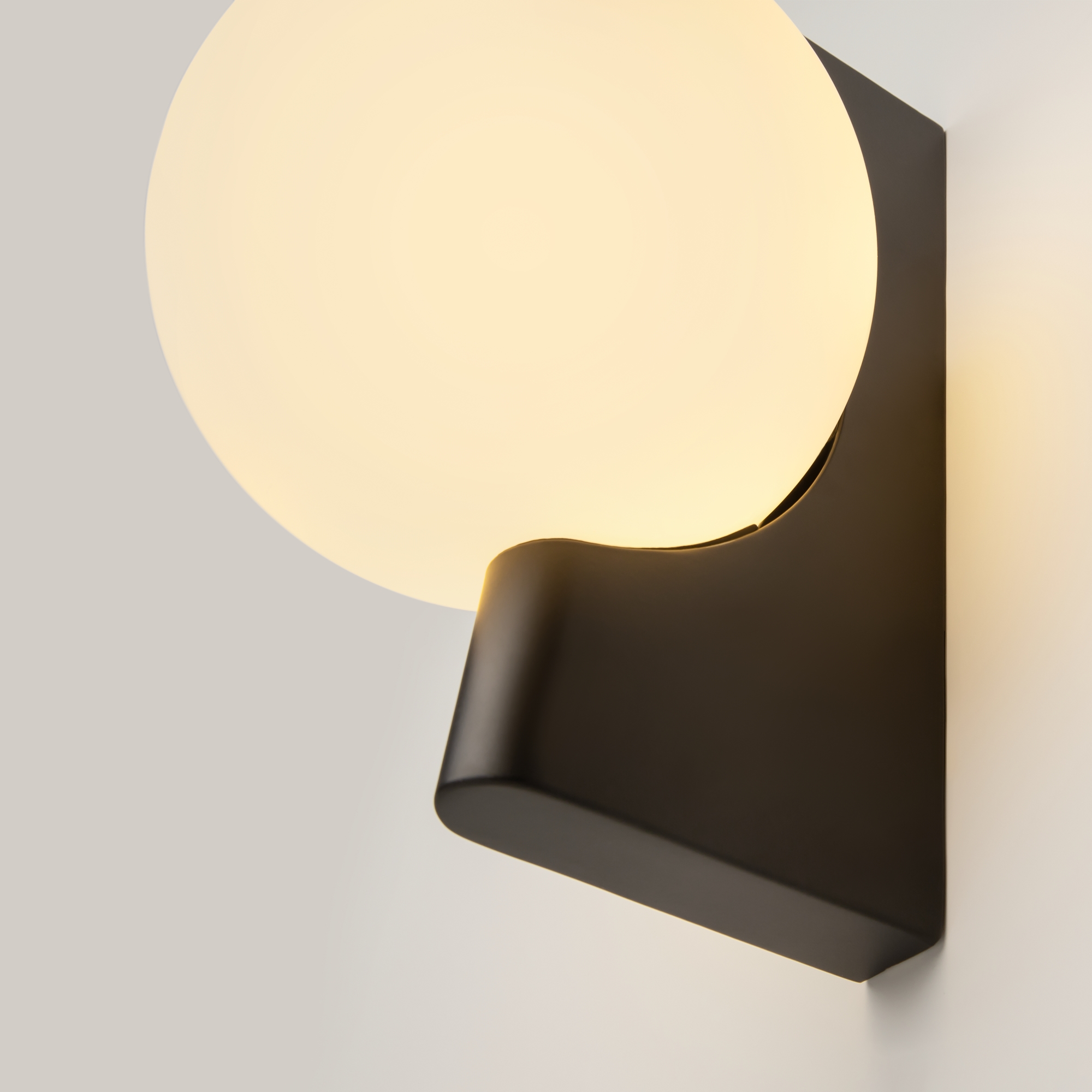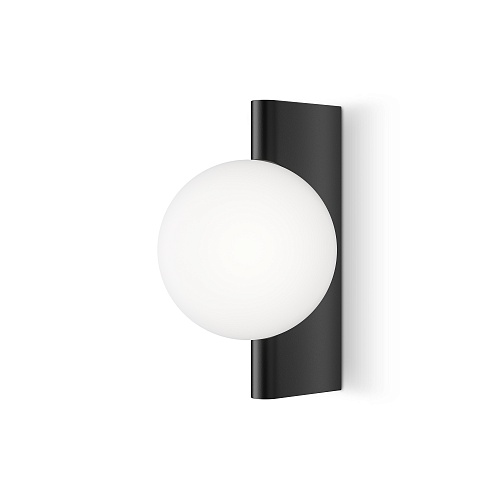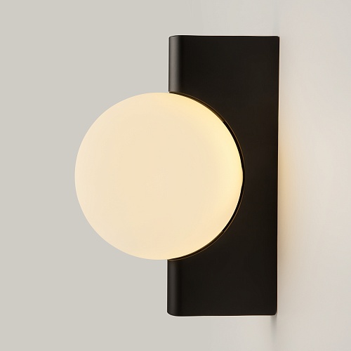Арматура из металла, цвета – матовый черный, латунь, хром. Плафон-сфера – стекло, цвет – белый. Скрытое крепление. Оригинальная геометрия в дизайне. Чистый теневой рисунок