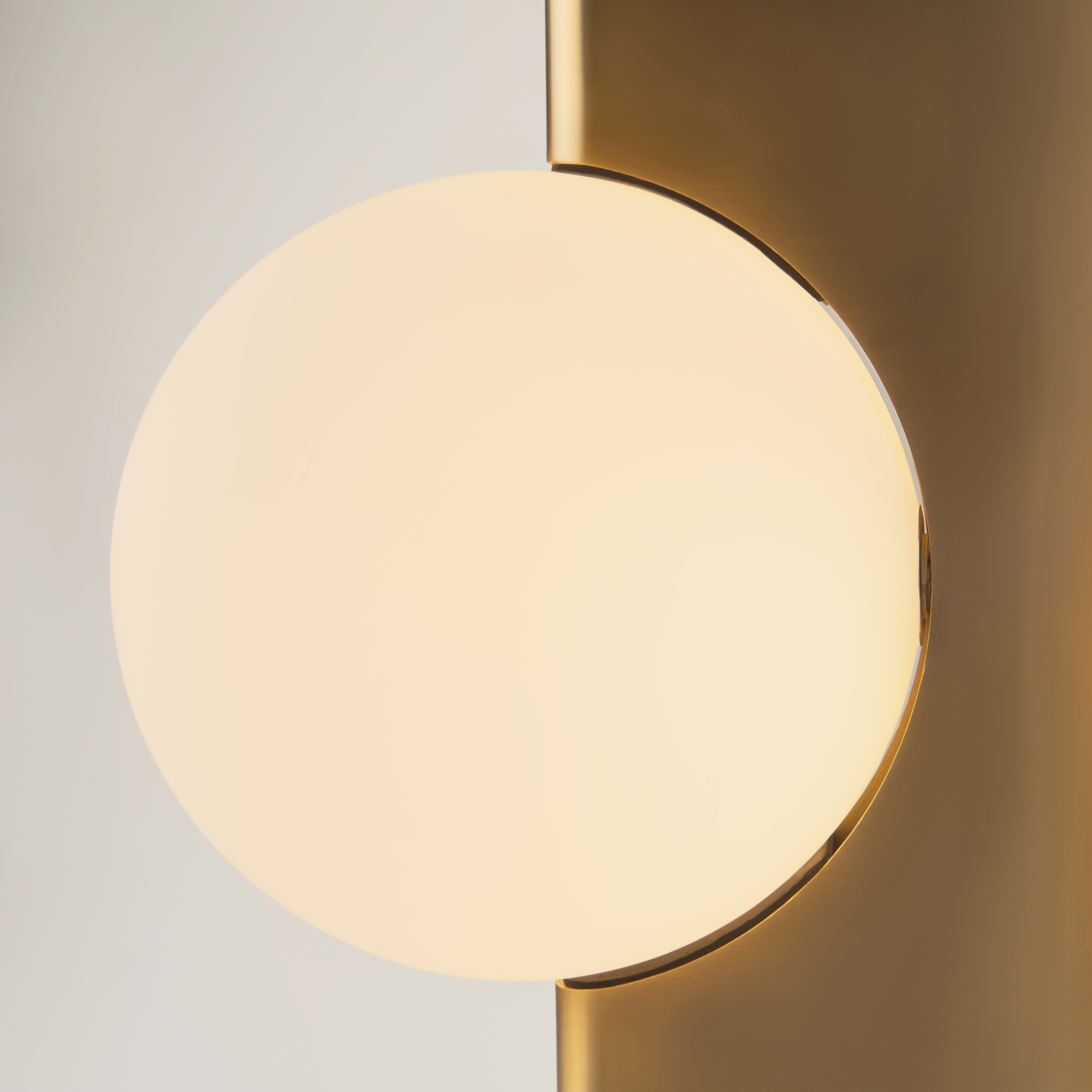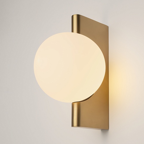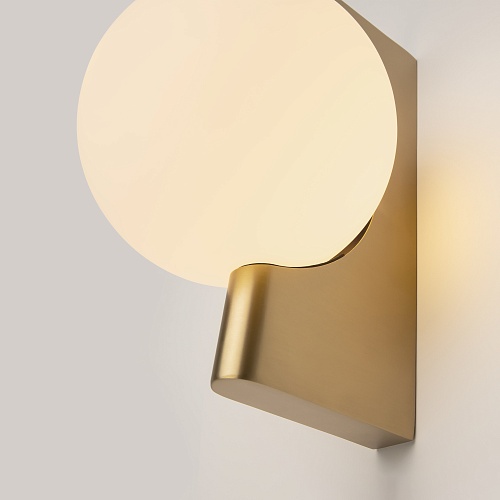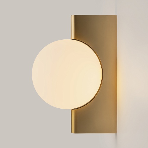 Арматура из металла, цвета – матовый черный, латунь, хром. Плафон-сфера – стекло, цвет – белый. Скрытое крепление. Оригинальная геометрия в дизайне. Чистый теневой рисунок
