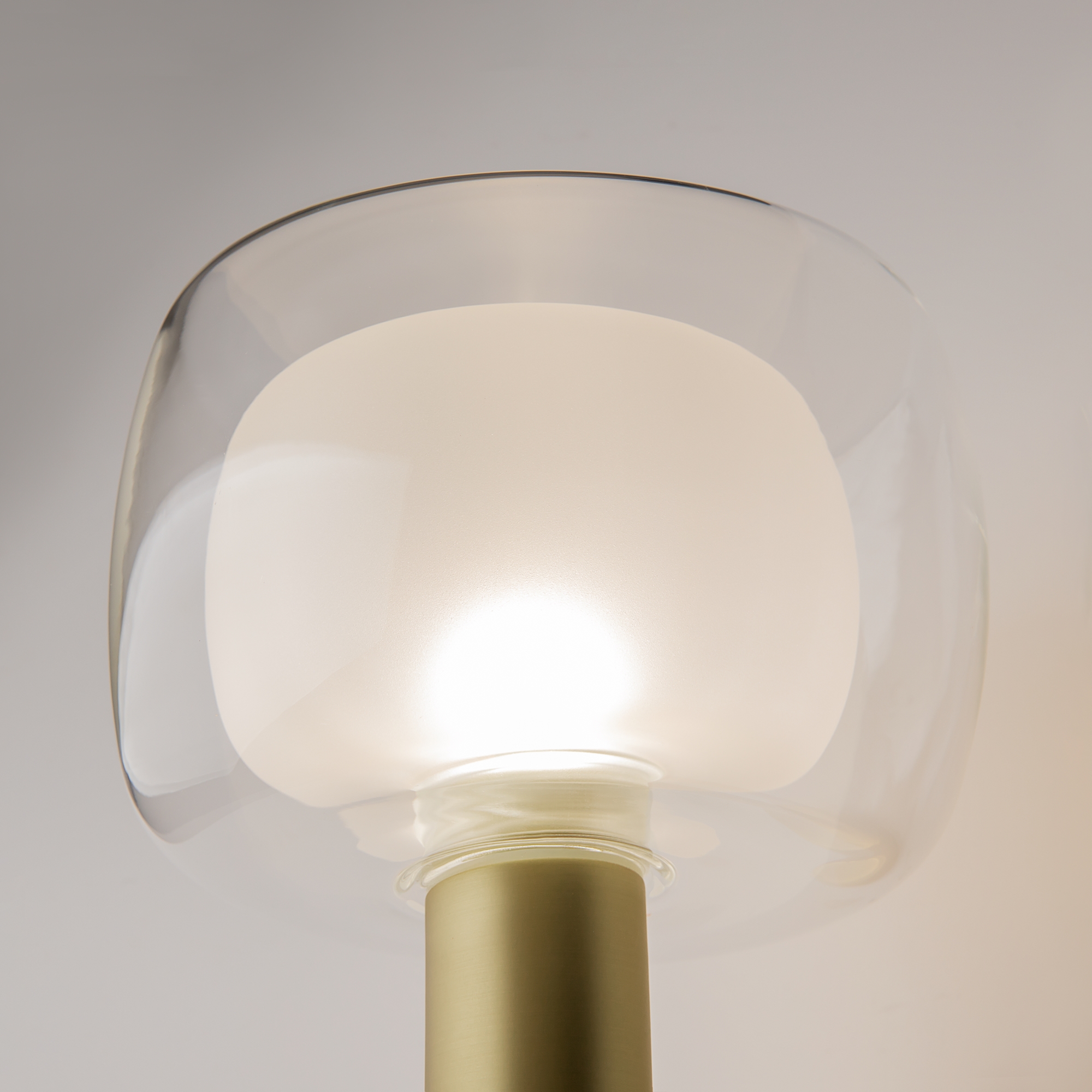 Арматура – алюминий, цвет – золото. Двойной стеклянный плафон: внутренний – матовый, внешний – прозрачный. Стиль – итальянская неоклассика. Культовые формы 60-х в дизайне.