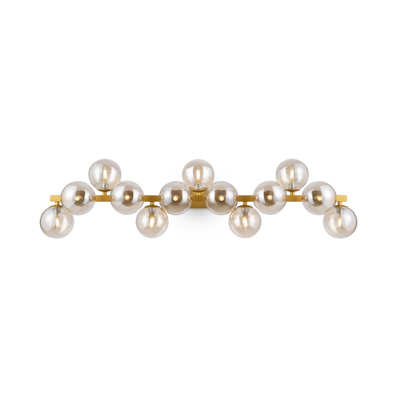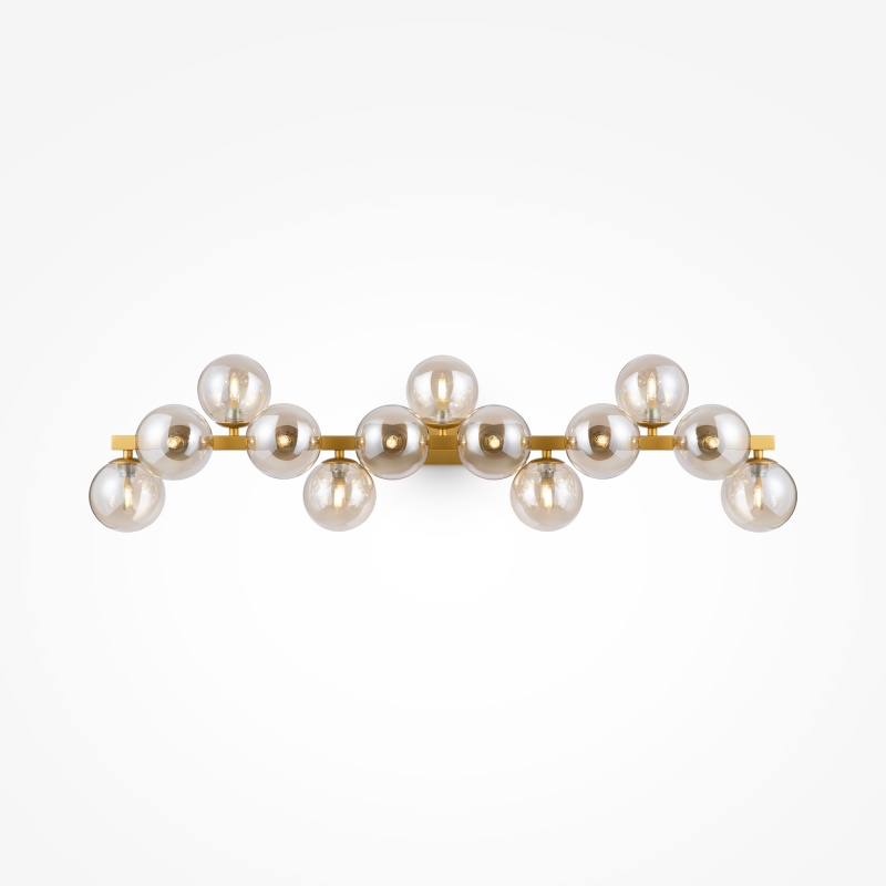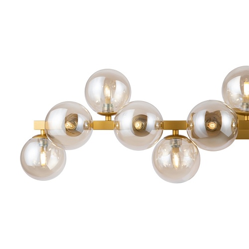 Металлическая арматура в четырех цветах: матовый черный, хром, золото, латунь. Плафоны — выдувное стекло. Цвета — дымчатый, янтарный, коньячный. Дизайн с имитацией молекулярной структуры. Высота подвесных светильников регулируется тросом. Лампа с цоколем G9.