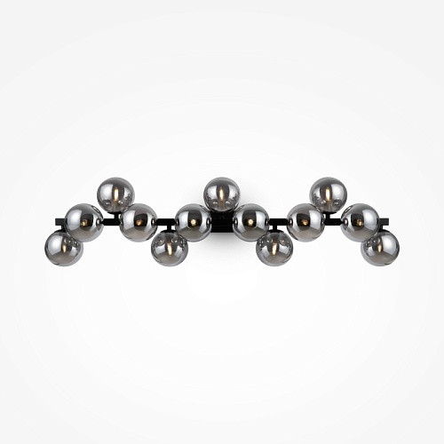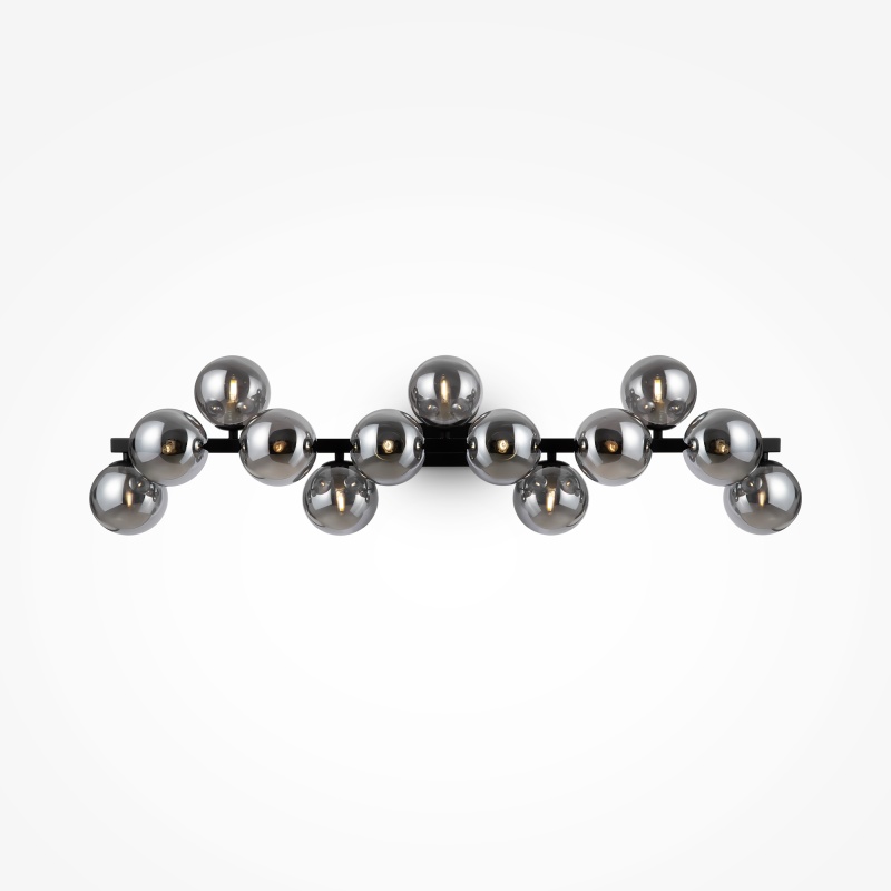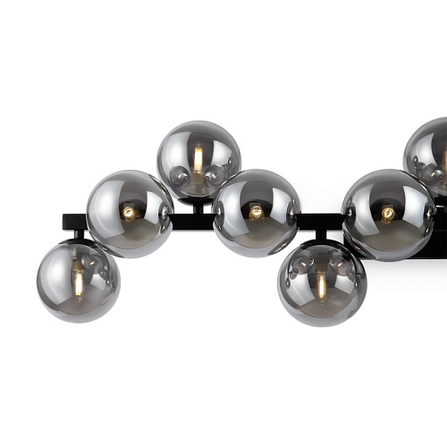 Металлическая арматура в четырех цветах: матовый черный, хром, золото, латунь. Плафоны — выдувное стекло. Цвета — дымчатый, янтарный, коньячный. Дизайн с имитацией молекулярной структуры. Высота подвесных светильников регулируется тросом. Лампа с цоколем G9.