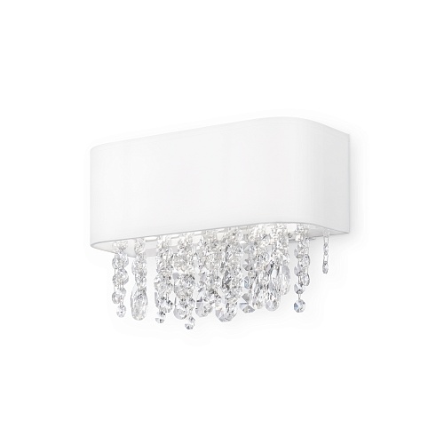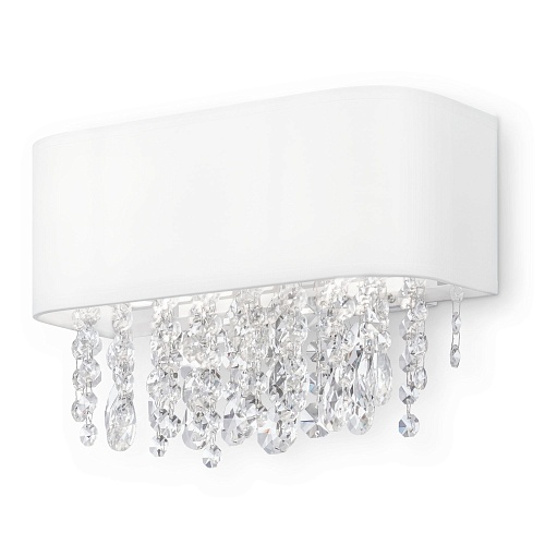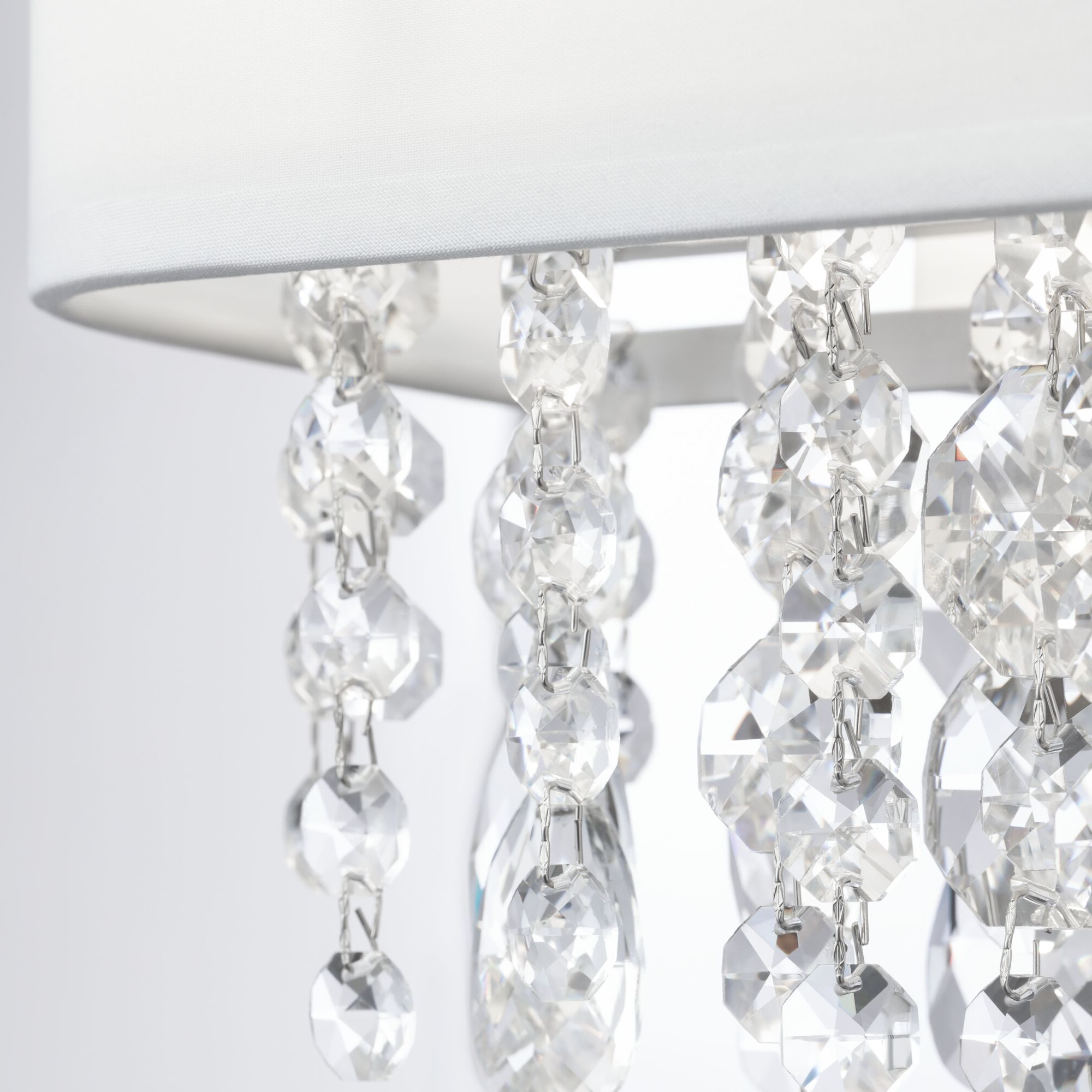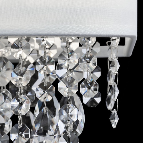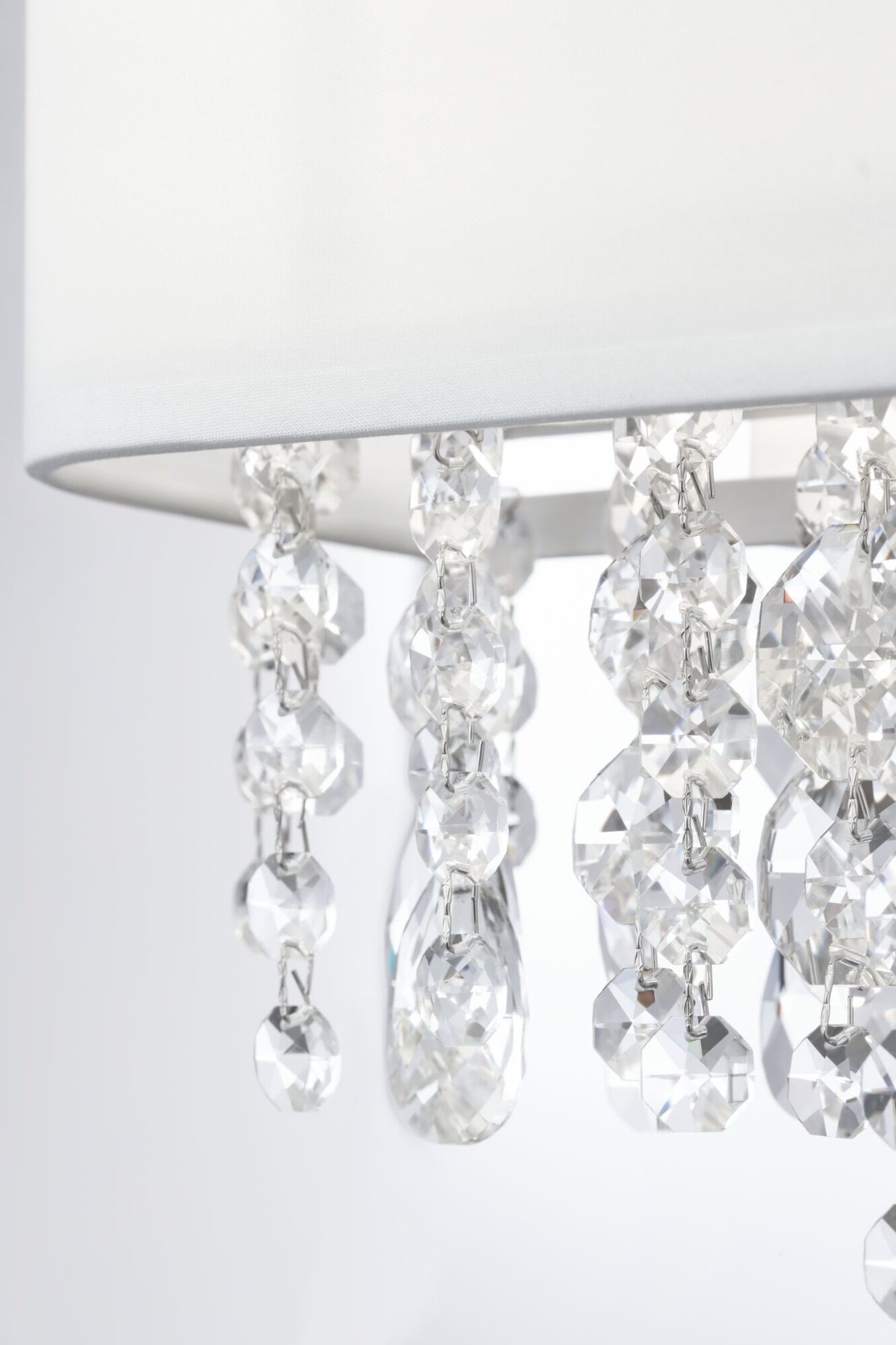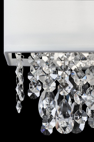 Металлическая арматура в белом цвете. Абажур – ткань, нанесенная на ПВХ, цвет – белый. Декор – подвески в виде граненых кристаллов. Высота подвесных светильников регулируется тросом.