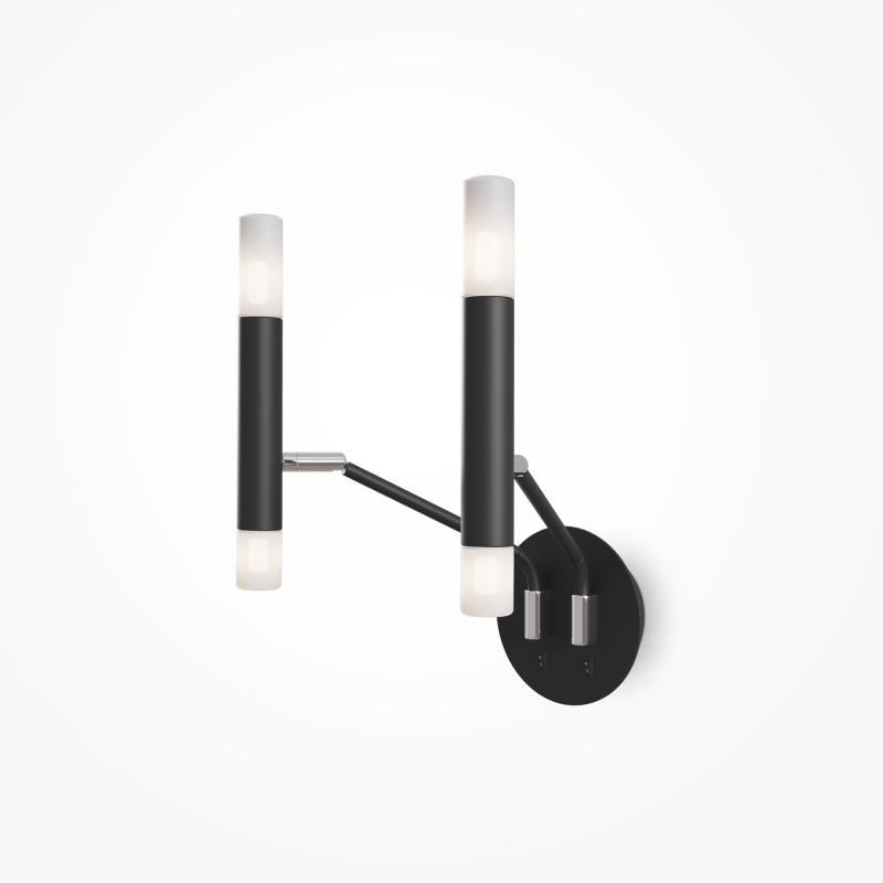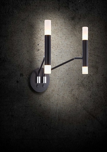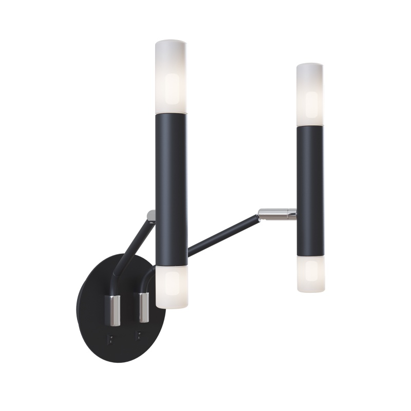 Металлическая арматура в матовом черном цвете. Цилиндрические плафоны вра щаются на 340° по горизонтали и 90° по вертикали. Возможность видоизменять дизайн светильника. Рассеиватель из матового стекла.