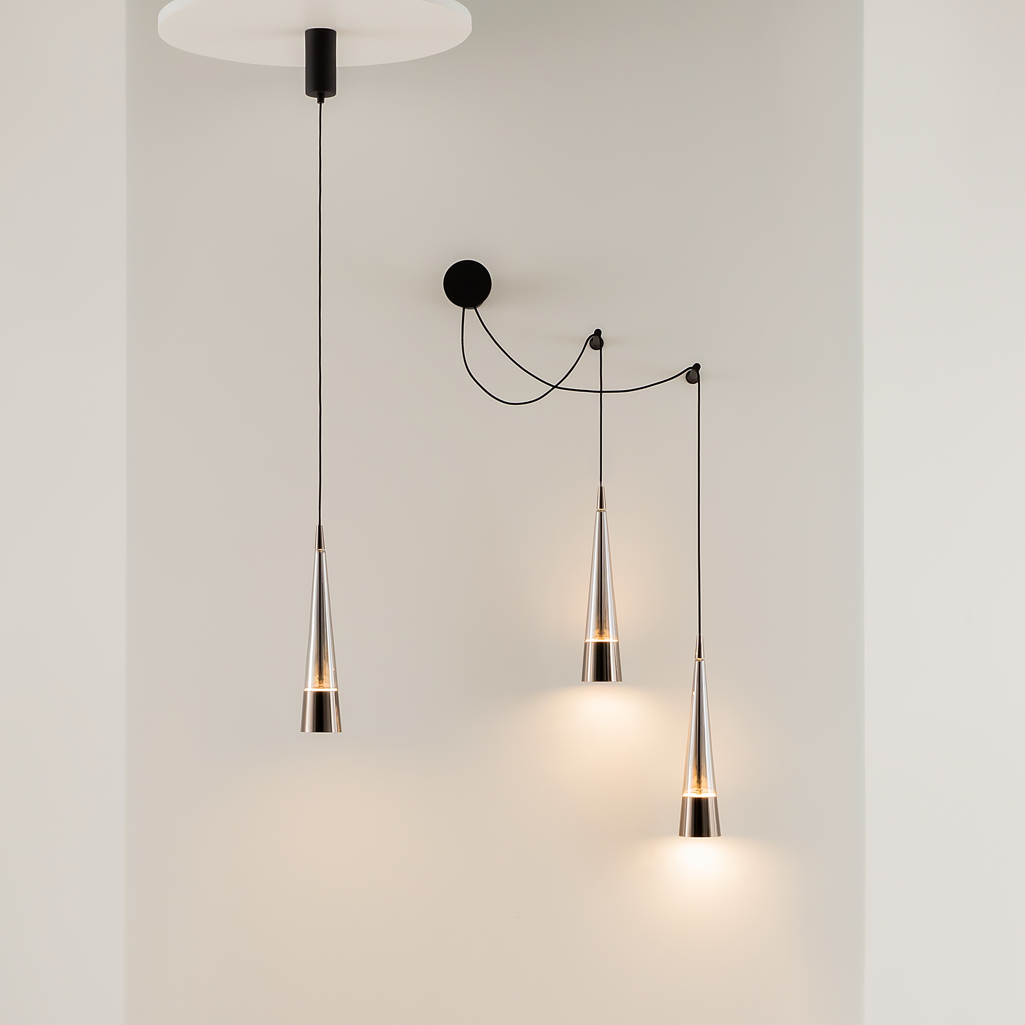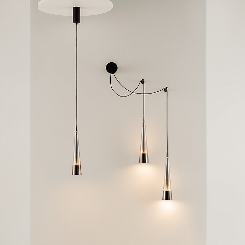 Хромированная металлическая арматура. Плафоны из стекла, цвет – хром. LED-источник с цветовой температурой 3000К. Двунаправленный световой поток – вверх и вниз. Оптический эффект волны по внешнему стеклянному элементу.