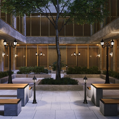 Серия уличных светильников разных размеров и способов монтажа. Модели серии хранят традиции классического садово-паркового искусства. Корпуса светильников изготовлены по технологии художественного литья из устойчивого к перепадам температуры и коррозии алюминиевого сплава. При окрашивании использовалась кузнечная краска с патиной зеленого и бронзового цветов. В качестве источников света используются лампы c цоколем E27.