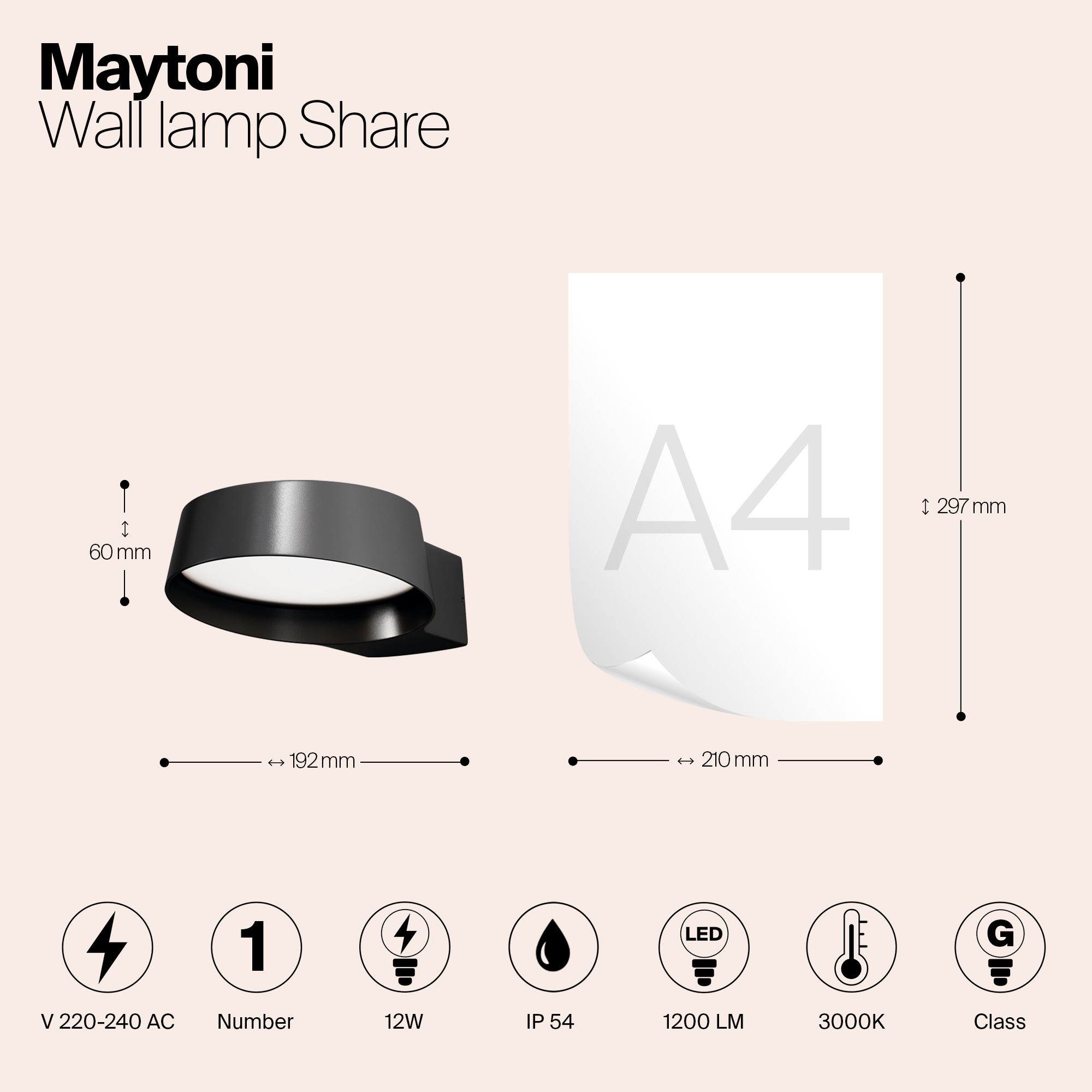 Материал корпуса - алюминий, цвет - графит. Белый рассеиватель из акрила. LED-источник света, цветовая температура - 3000К. Степень защиты - IP54.