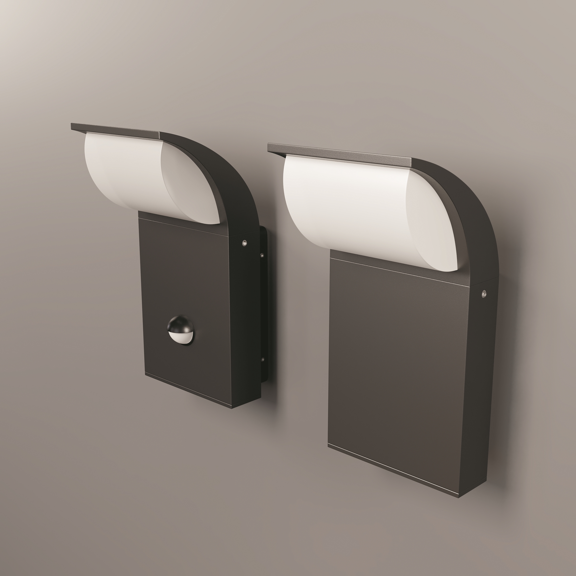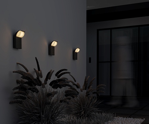 Материал корпуса - алюминий, цвет - графит. Белый матовый рассеиватель. LED-источник света. Цветовая температура 3000К. Наличие встроенного датчика движения у настенной модели. Степень защииты IP65 и IP44 настенной модели с датчиком движения.