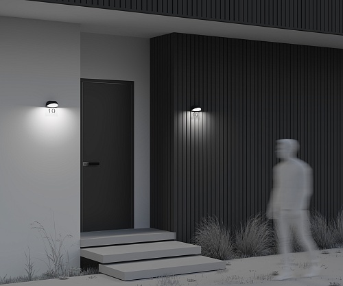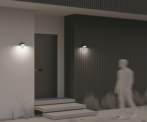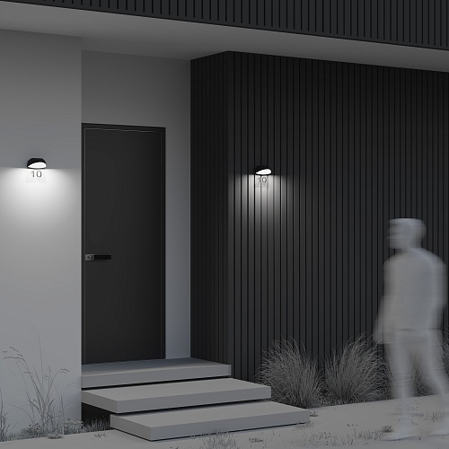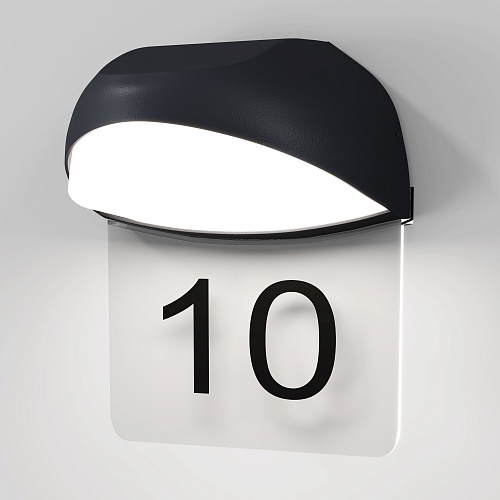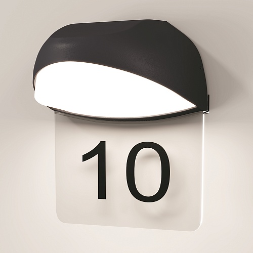 Алюминиевый корпус, цвет - графит. Рассеиватель из белого матового акрила. В комплекте - табличка из прозрачного пластика для нанесения обозначений (номера дома и др.). LED-источник света, цветовая температура 3000К. Степень защиты IP54.