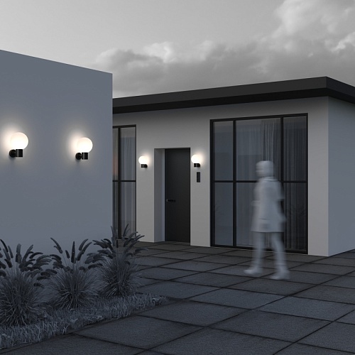 Алюминиевый корпус. Оттенки - черный, серый. Сферические плафоны из белого матового стекла. Защита от коррозии и перападов температур. Высокая степень защиты — IP 54. Источник света — лампа с цоколем E27.
