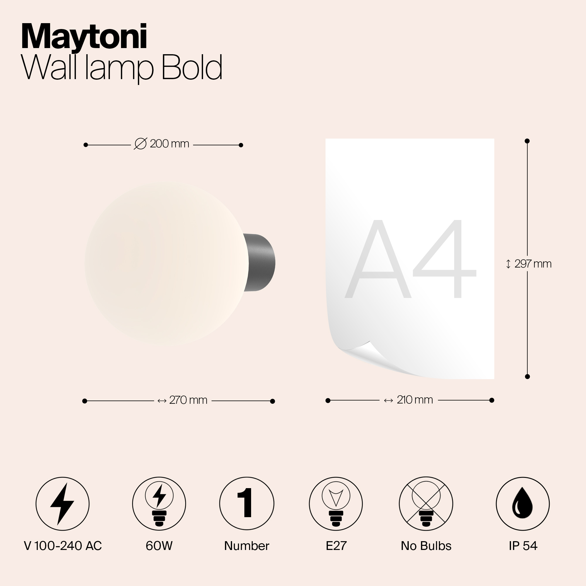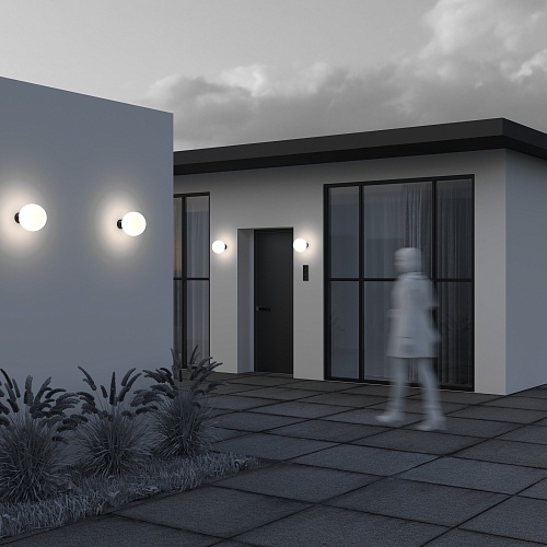 Алюминиевый корпус. Оттенки - черный, серый. Сферические плафоны из белого матового стекла. Защита от коррозии и перападов температур. Высокая степень защиты — IP 54. Источник света — лампа с цоколем E27.