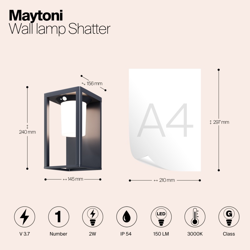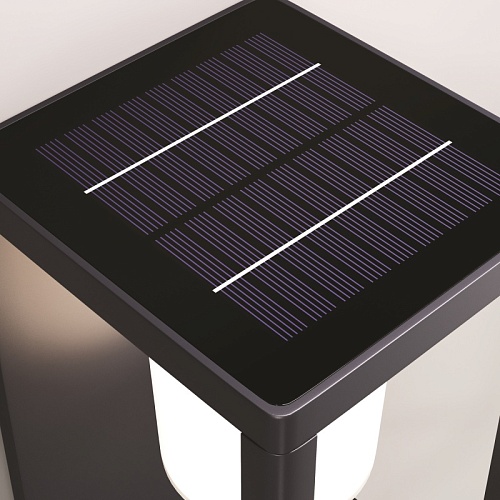 Алюминиевый корпус, цвет - графит. Питание от солнечной батареи, отсутствие проводов и необходимости подключения к электроэнергии. Работа до 14 часов без подзарядки. Встроенный датчик движения. Три режима работы. LED-источник света, цветовая температура - 3000К. Степень защиты - IP54.