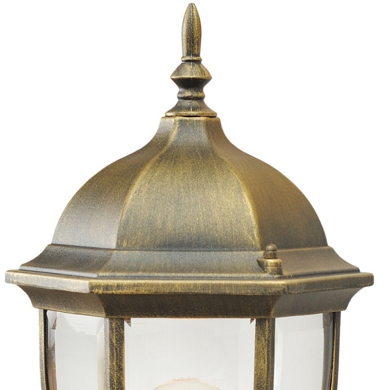 Корпус светильника выполнен из сплава алюминия с цинком и окрашен по технологии порошкового окрашивания в черный цвет с патинированием в цвет старинной позолоты. Плафон составляют одинакового размера пластины стекла, изогнутые по форме.