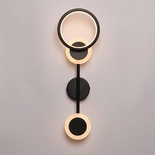 Металлическое основание настенного бра окрашено в черный цвет. Корпус плафона выполнен из сплава алюминия с цинком и окрашен в цвет основания. Светодиодные источники света закрыты матовым акрилом.
